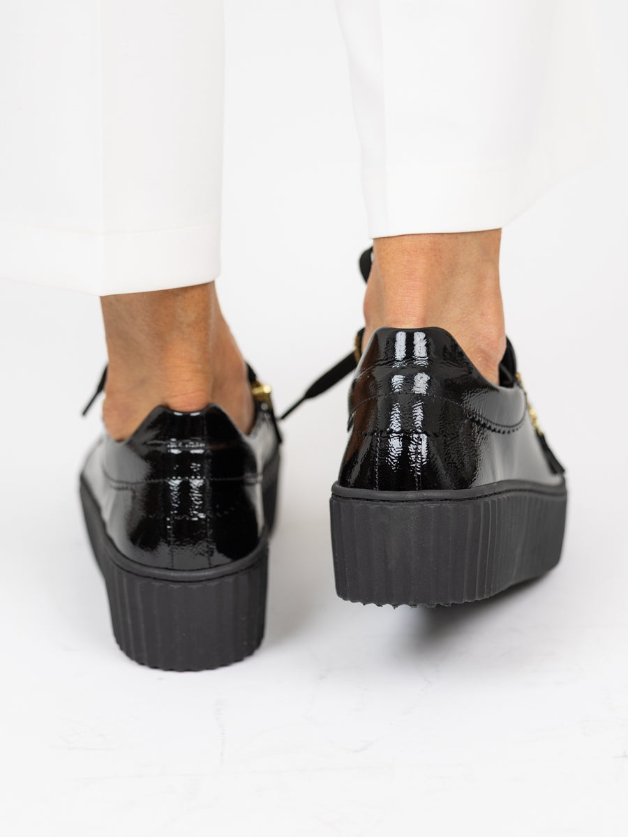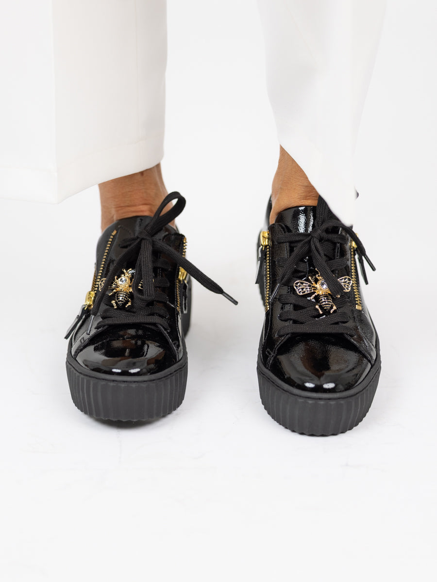 Dette er en sort sneaker i lakk med de kuleste detaljene. Snakeren har gull glidelåser på begge sider, en bie detalj på skolissen (avtakbar) og en høy gummisåle. God såle også inni skoen som gjør den svært komfortabel på foten.