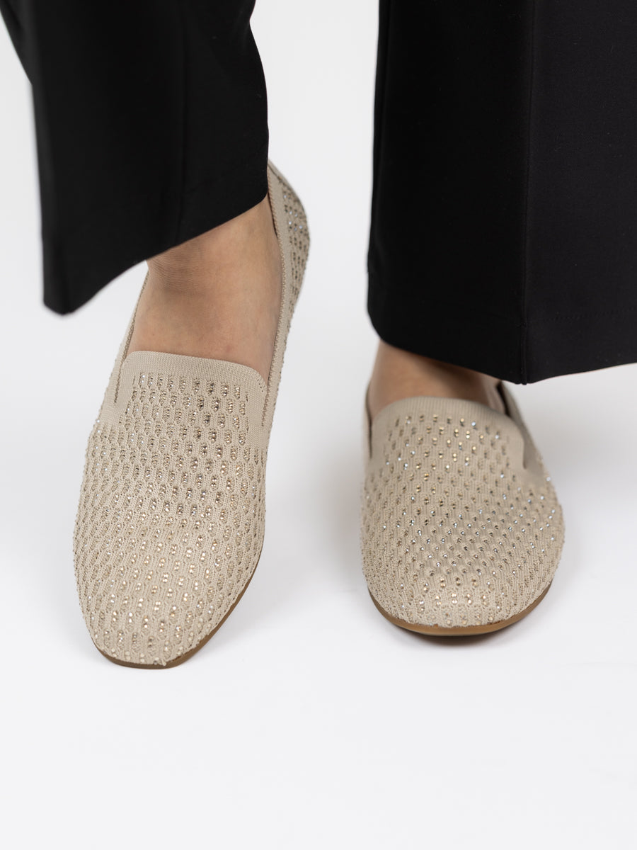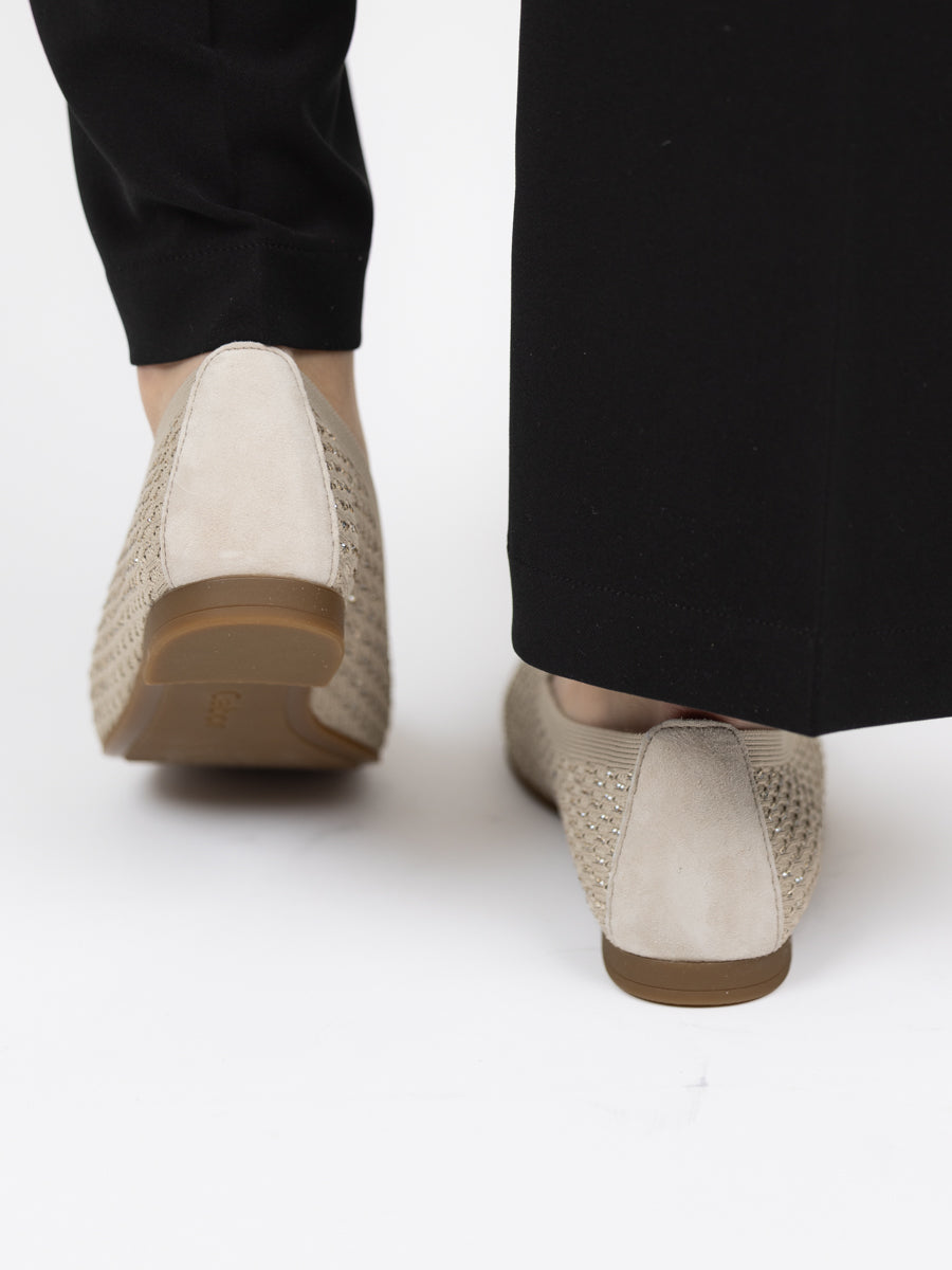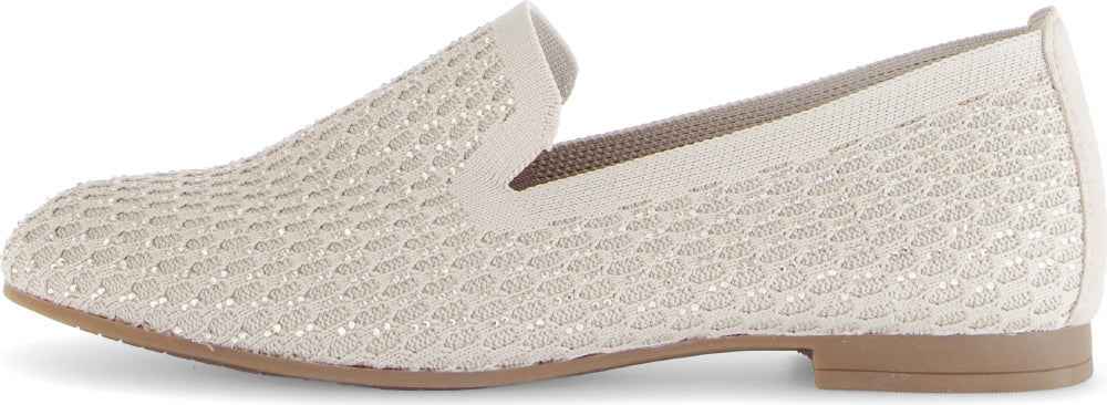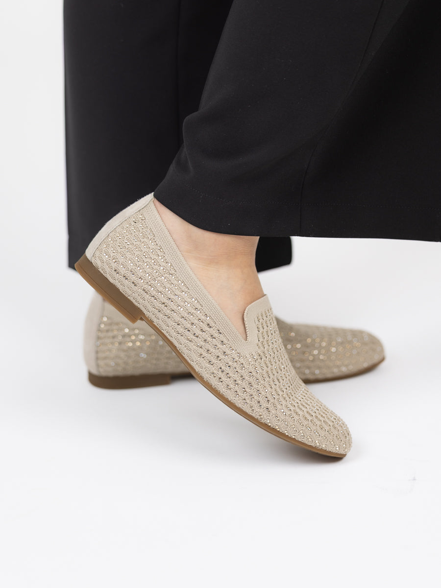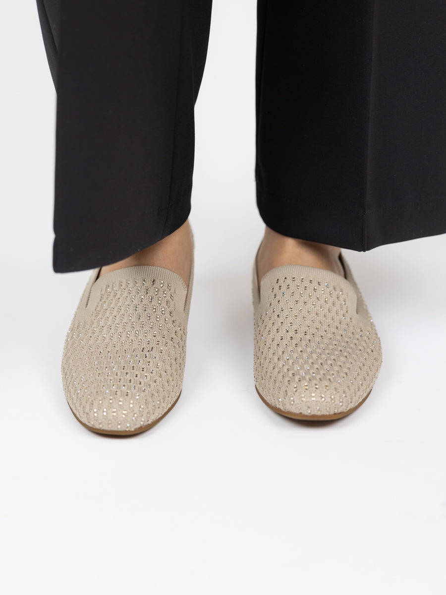 Her har vi en beige, glitrete, stretchy loafer med lav hel. Fin fasong og på helen er det en semsket skinndetalj. Det er en stødig og komfortabel gummisåle.