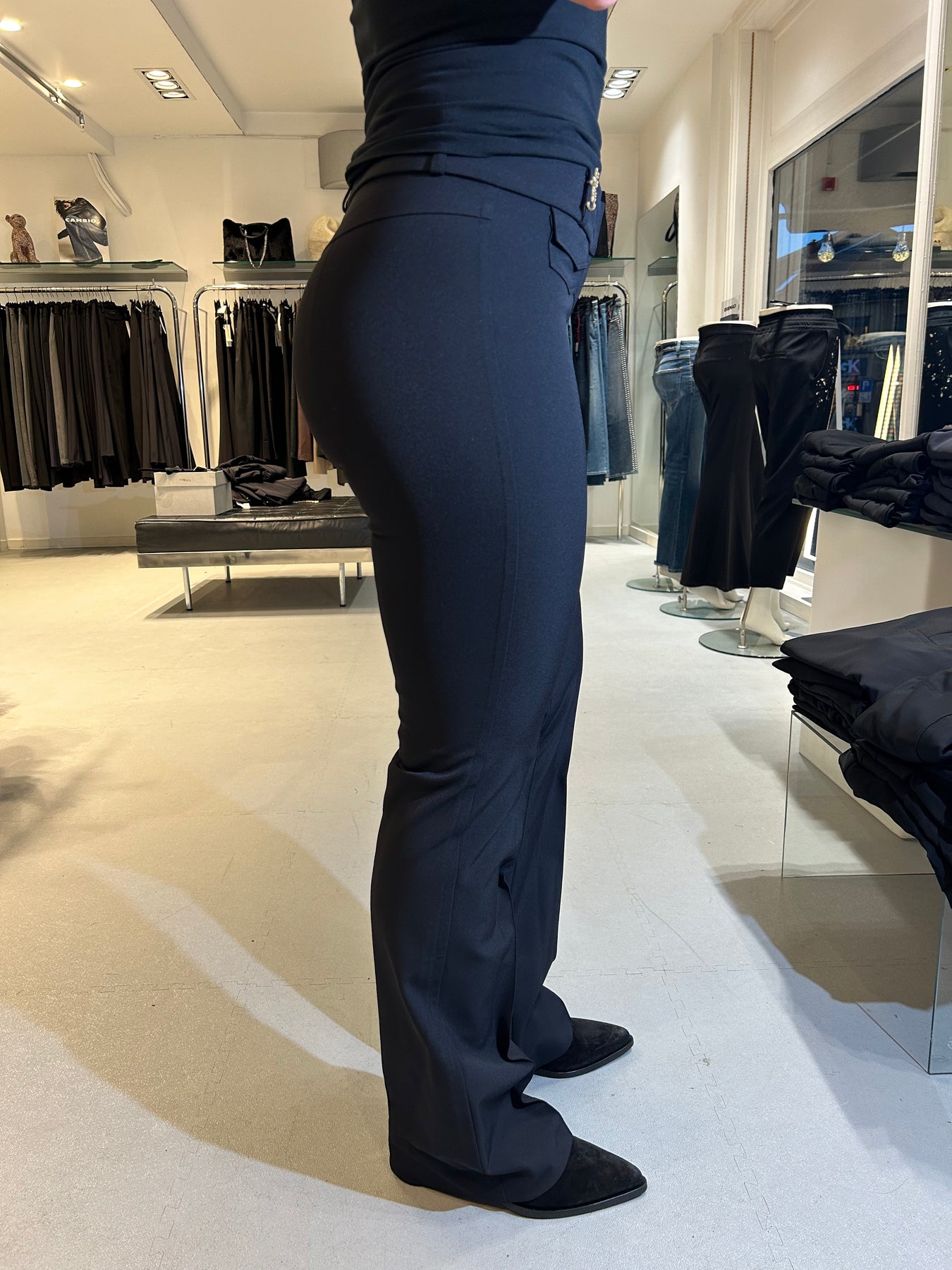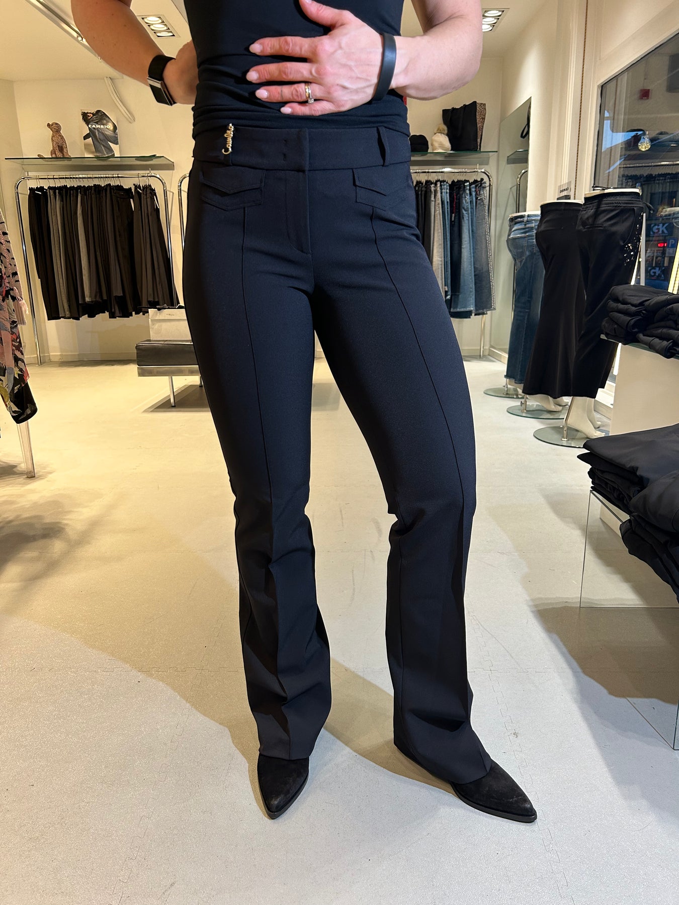 Farah har linning, knapp og glidelås foran, med en nydelig spennedetalj i fornt. Det er en modell med sydd presskant foran, høyt liv og god lengde.