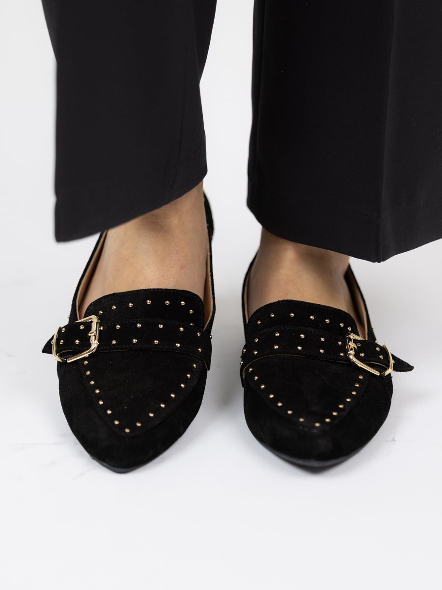 Sort spiss loafer i nydelig mykt semsket skinn. Lekre detaljer med gullstuds og spenne. Gummisåle.