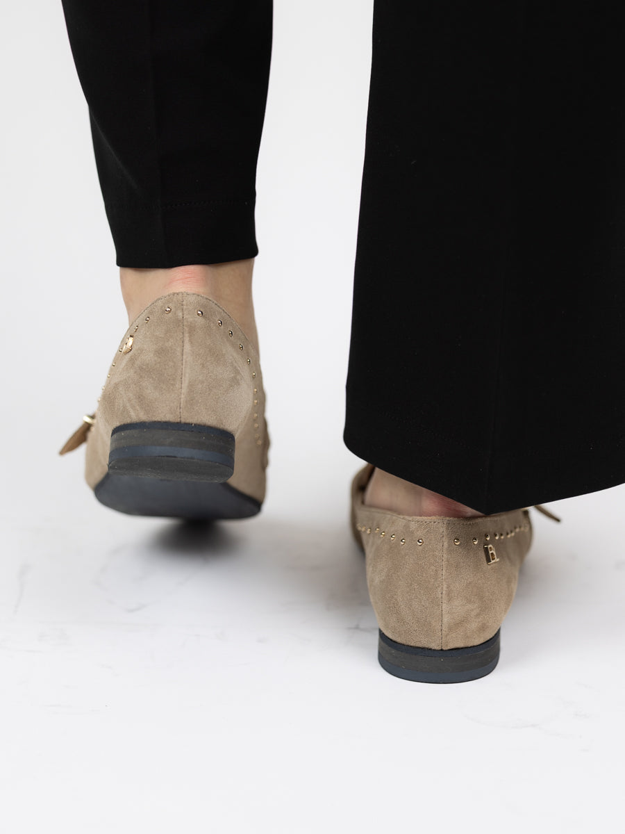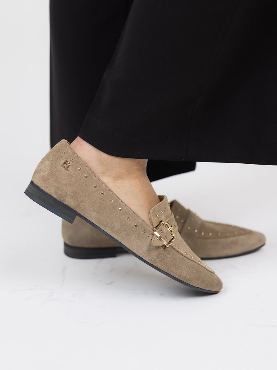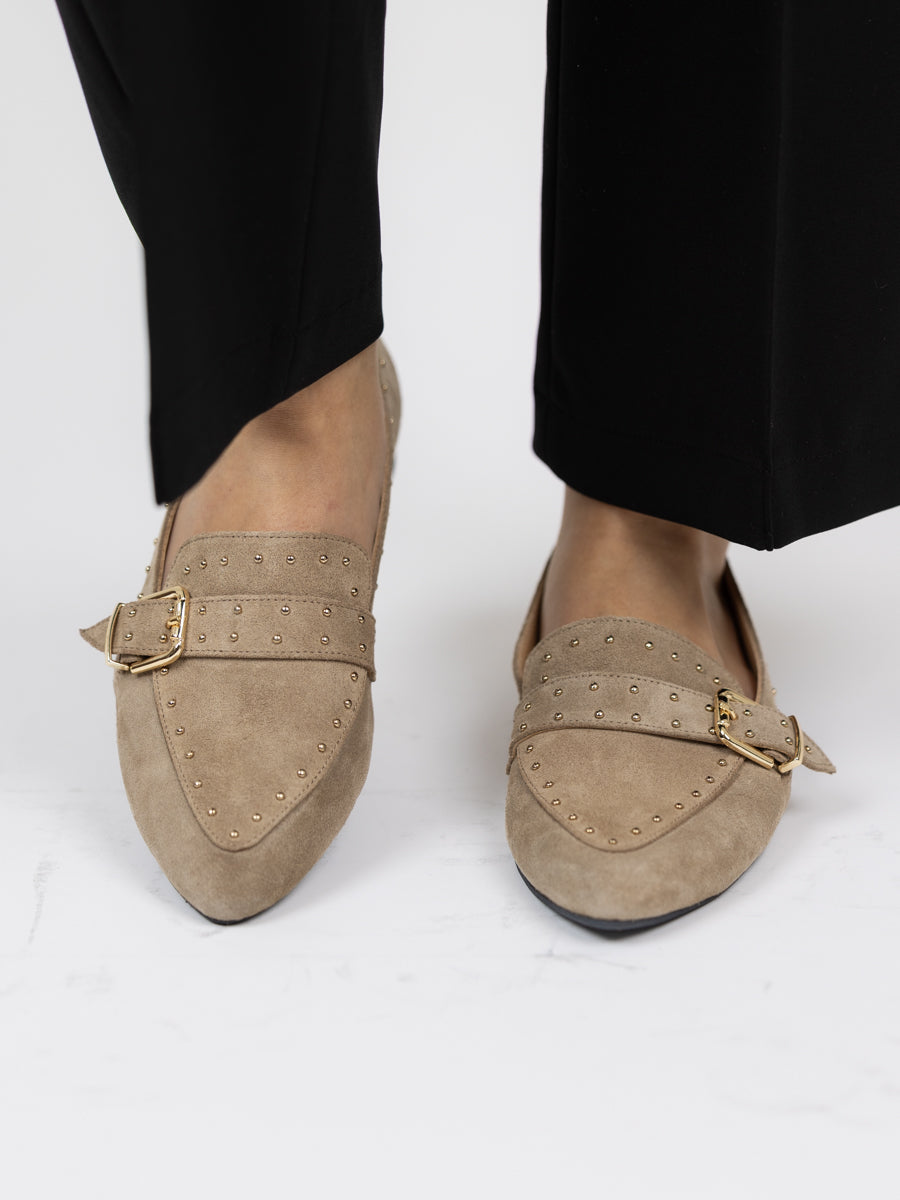 Beige spiss loafer i nydelig mykt semsket skinn. Lekre detaljer med gullstuds og spenne. Gummisåle.