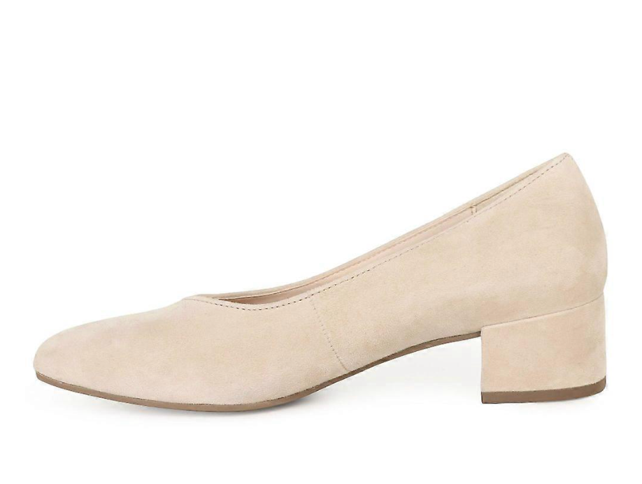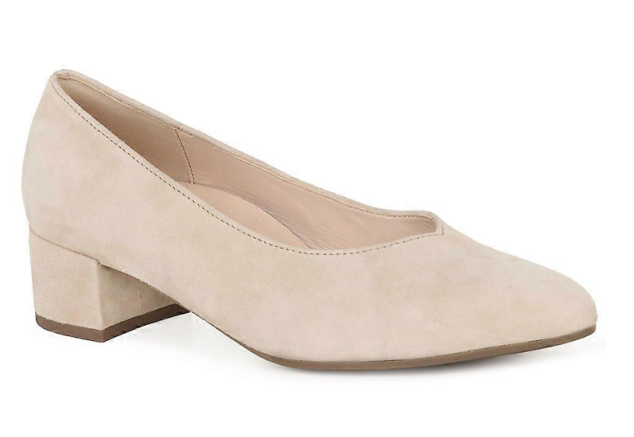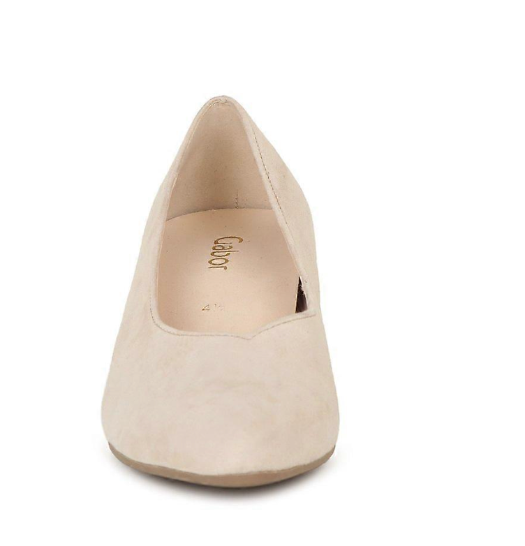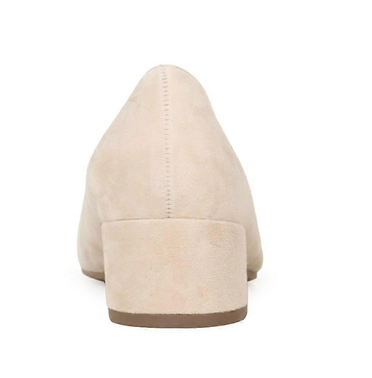Spiss pumps i nydelig lys sandfarge i mykt semsket skinn med liten hel.