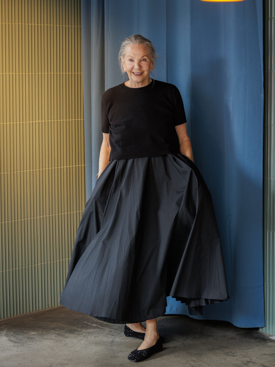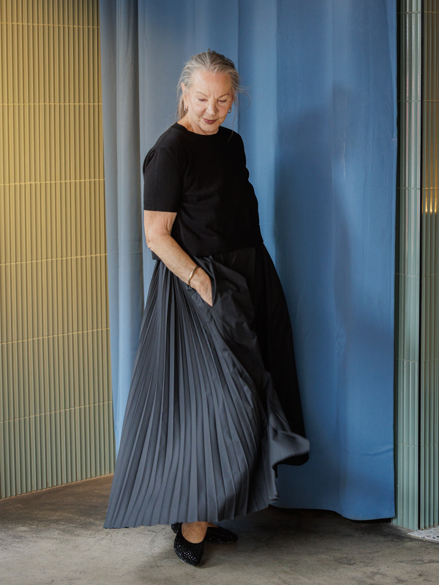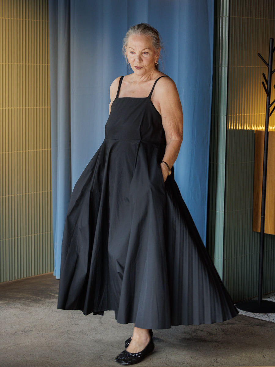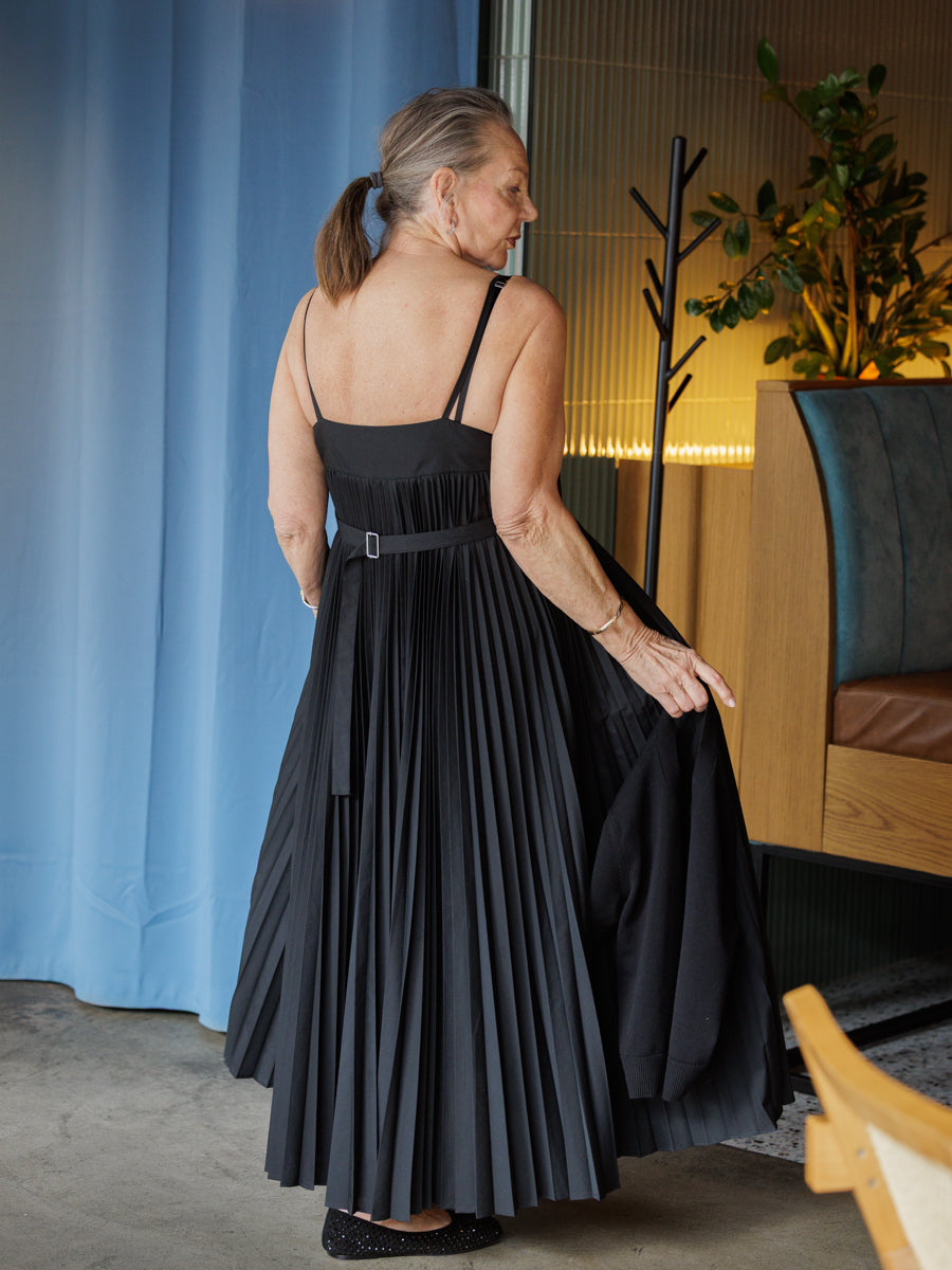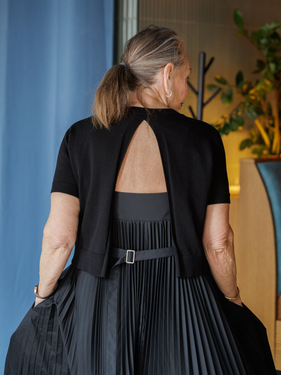 Dette må være årets mest spennende kjole! Todelt kjole slik at den kan brukes både med og uten genseren. Lang kjole med stropper på underdelen og plisse i skjørtet. Kommer med en strikket genseroverdel med kort arm og som er åpen bak.