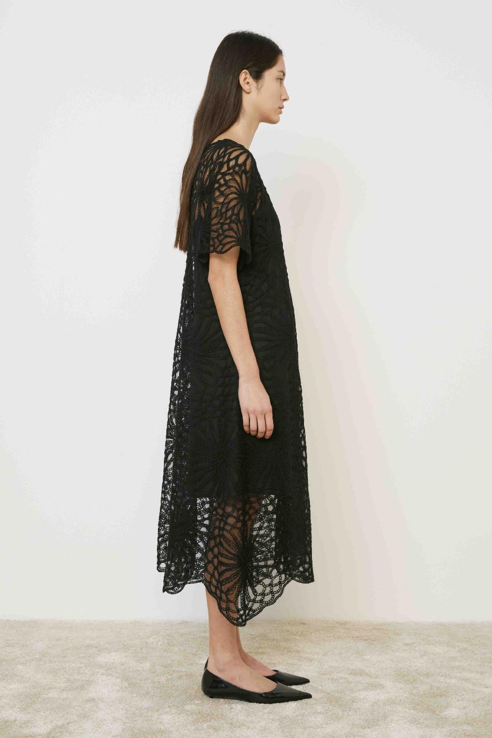 Den er sort med rund hals. Ermene er korte og når omtrendt midt på overarmen. Det er vide ermer og utsving fra livet og ned. En kjolemodell med god lengde som stopper litt over anklene.