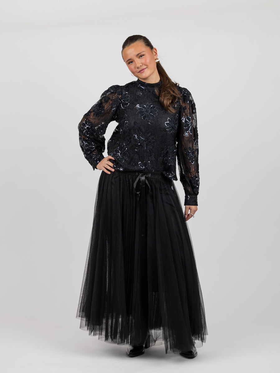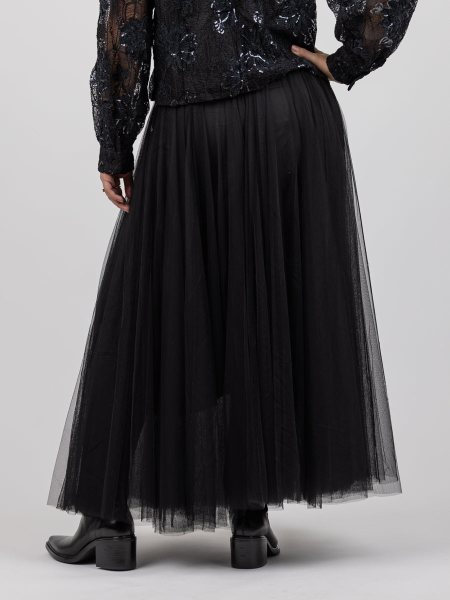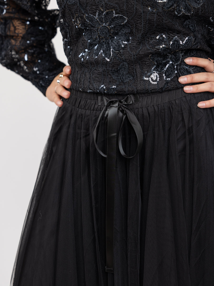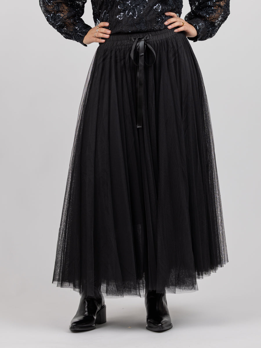 Sort lekkert tyllskjørt med strikk i livet og snøring foran. Sitter flott på, går til ankelen.