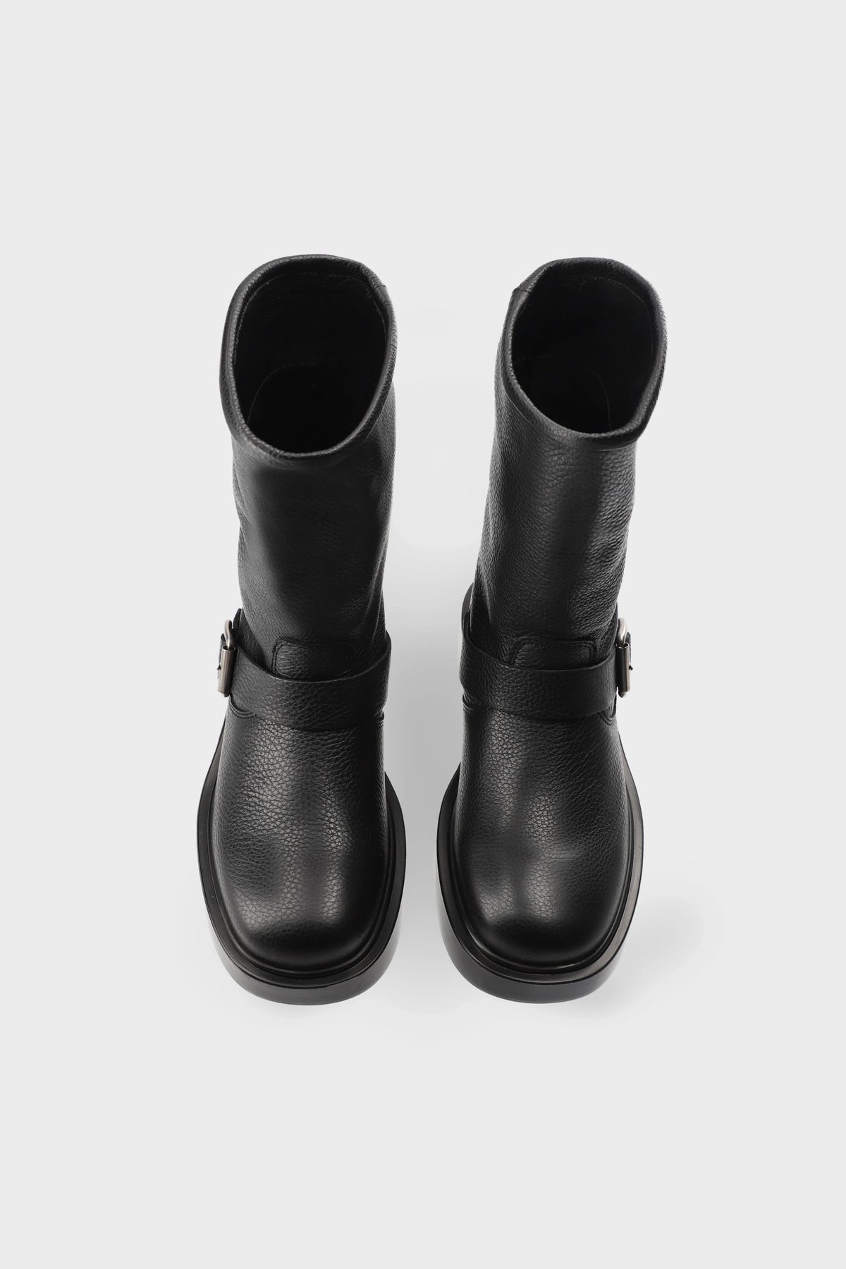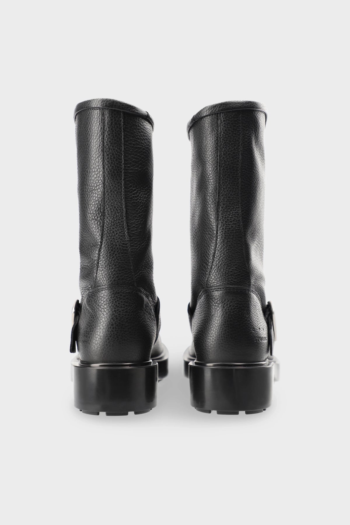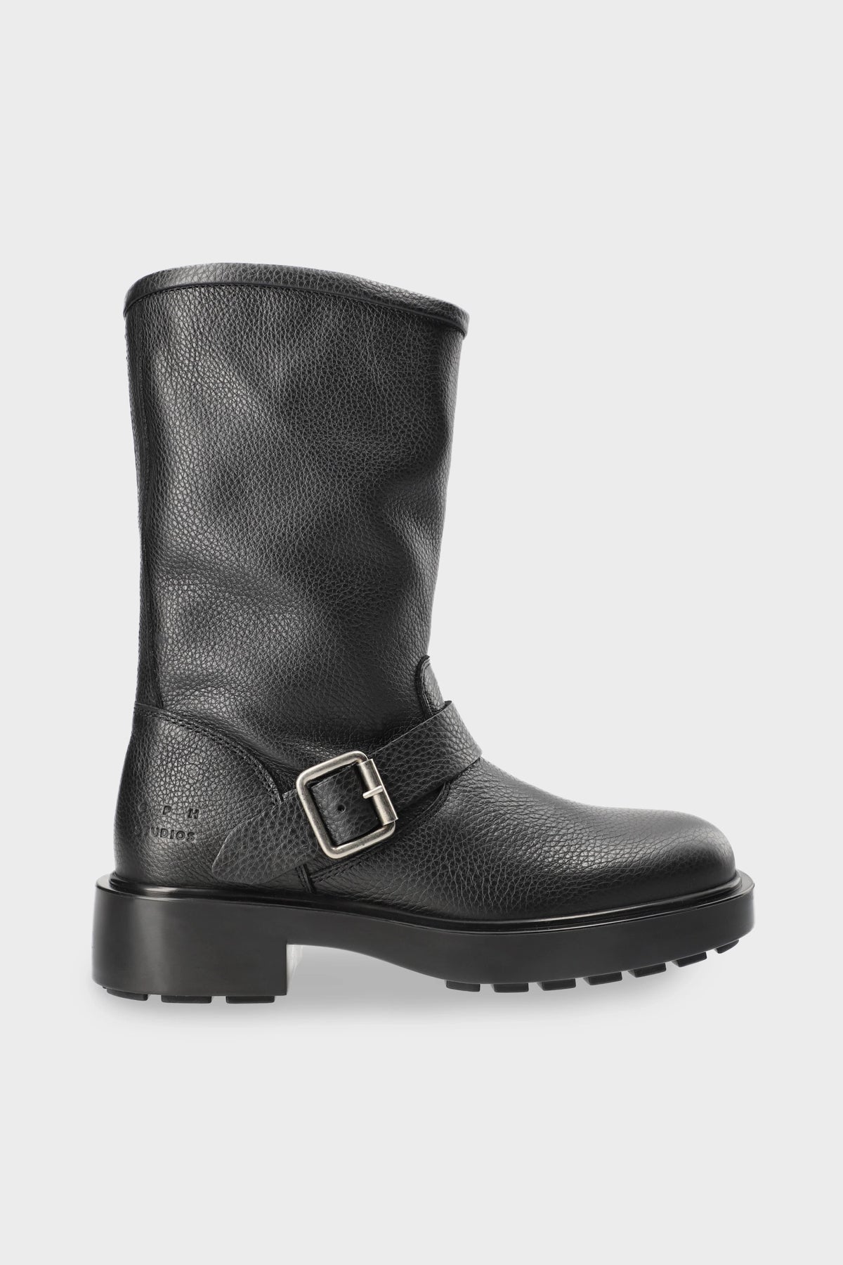 Sort Biker boots i sort mykt glatt skinn med flott gummisåle. Uten glidelås med rem over vristen.