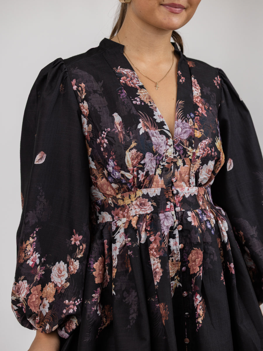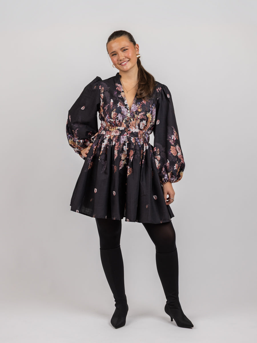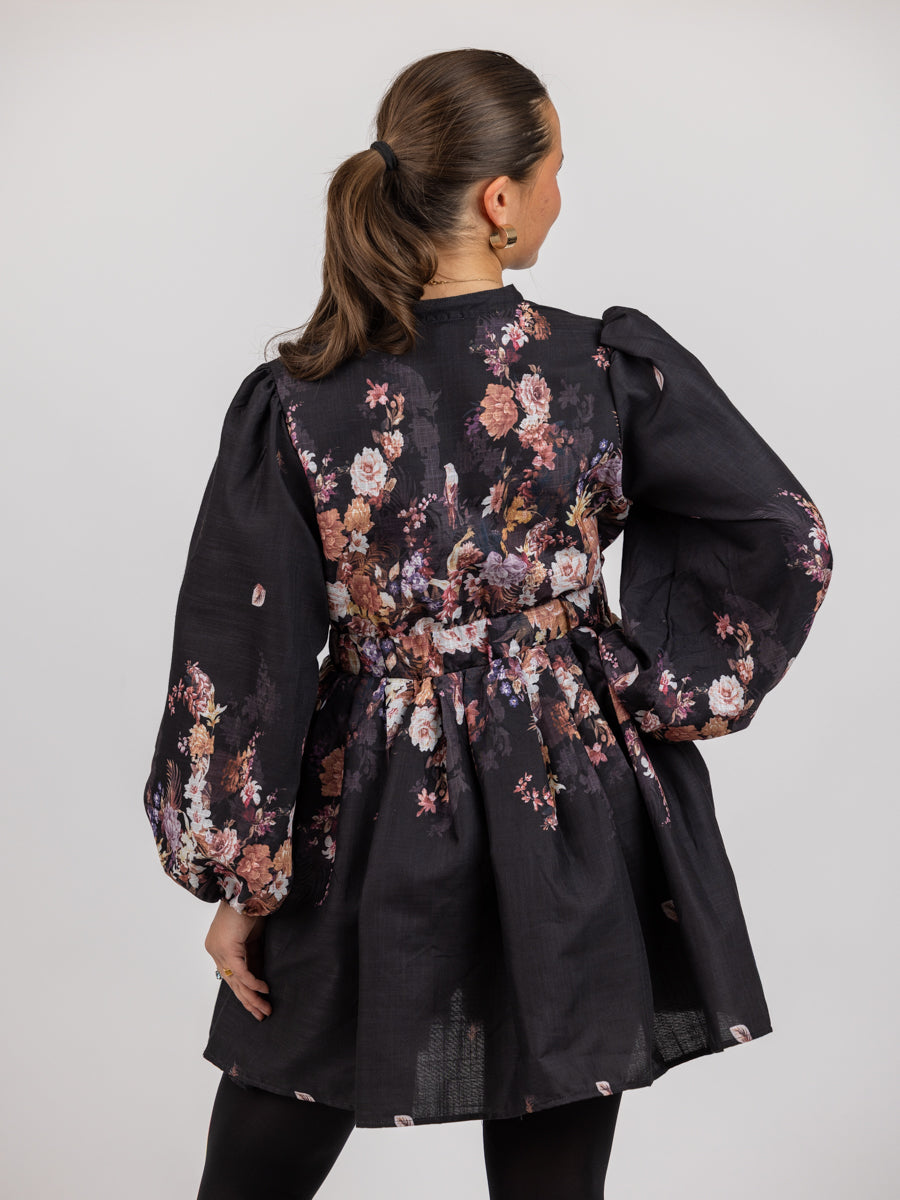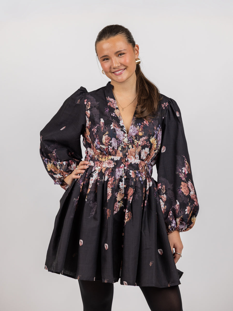 Superflott sort kort kjole med vakkert blomstermønster i delikate farger, med lang arm med strikk, knapper foran.