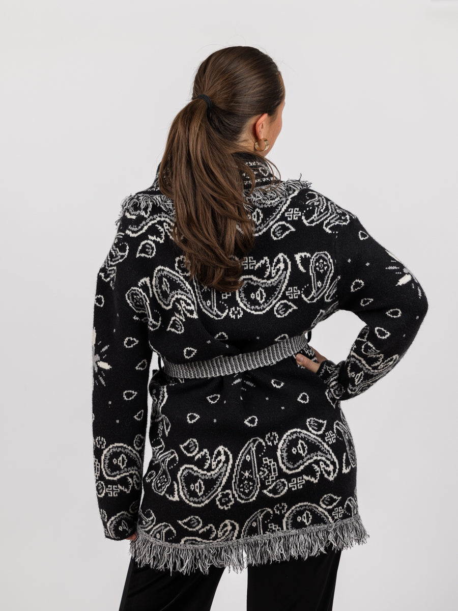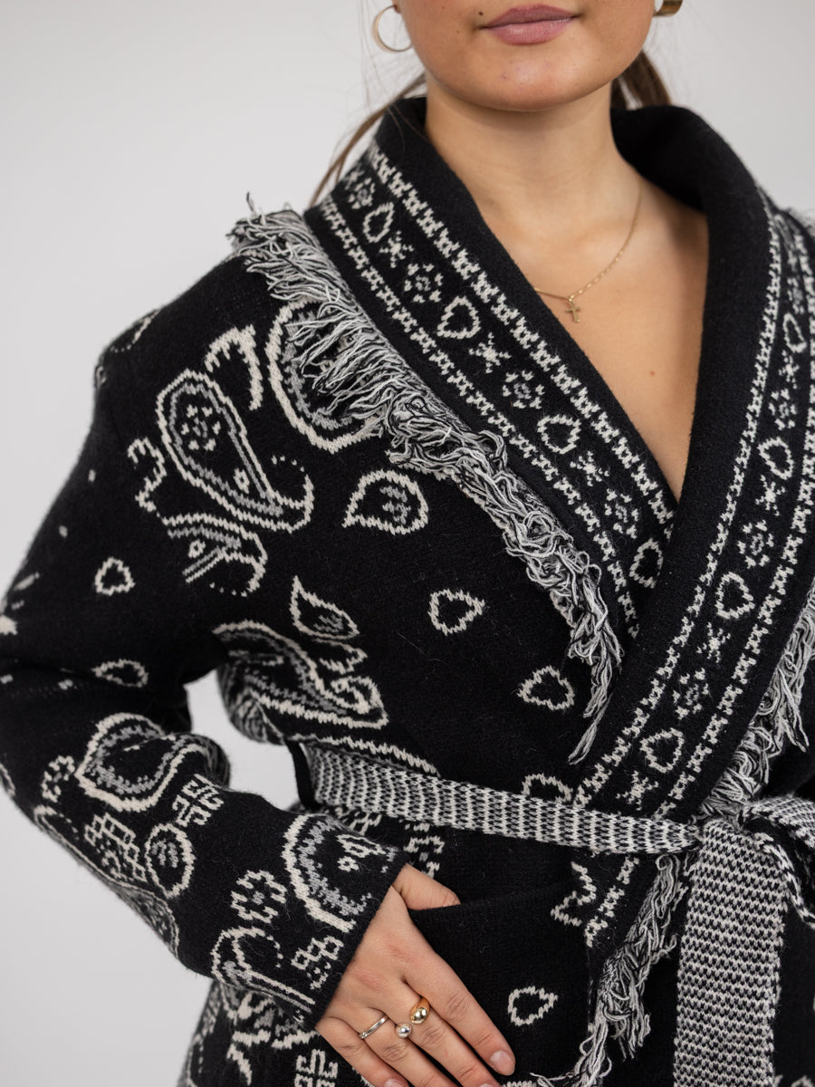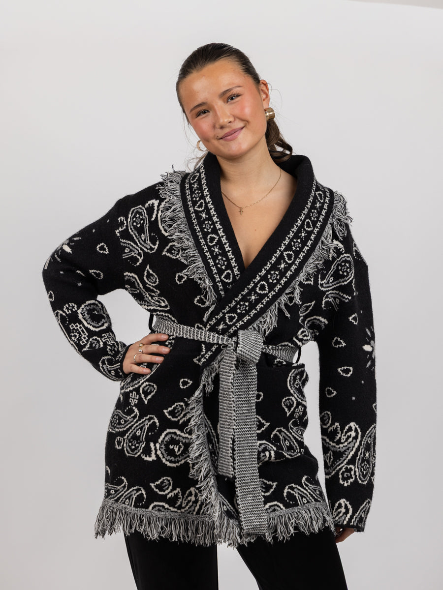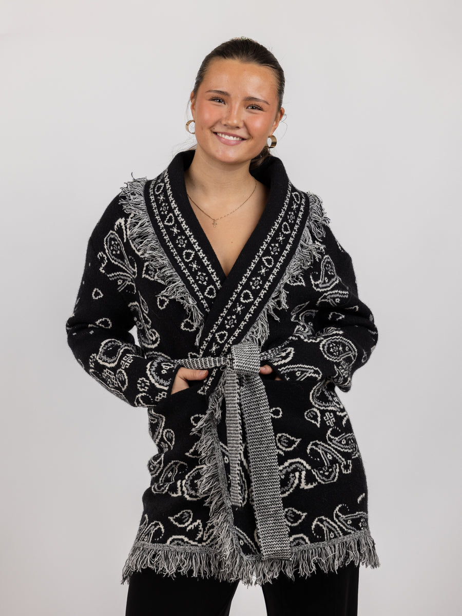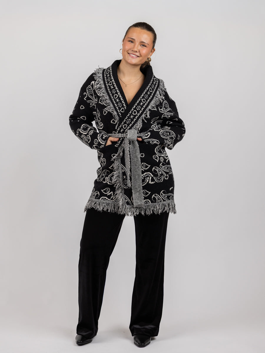 Superflott strikkecardigan i sort med hvit inkamønster og frynser, kommer med belte. Superkul modell, like fin til jeans som over kjole.