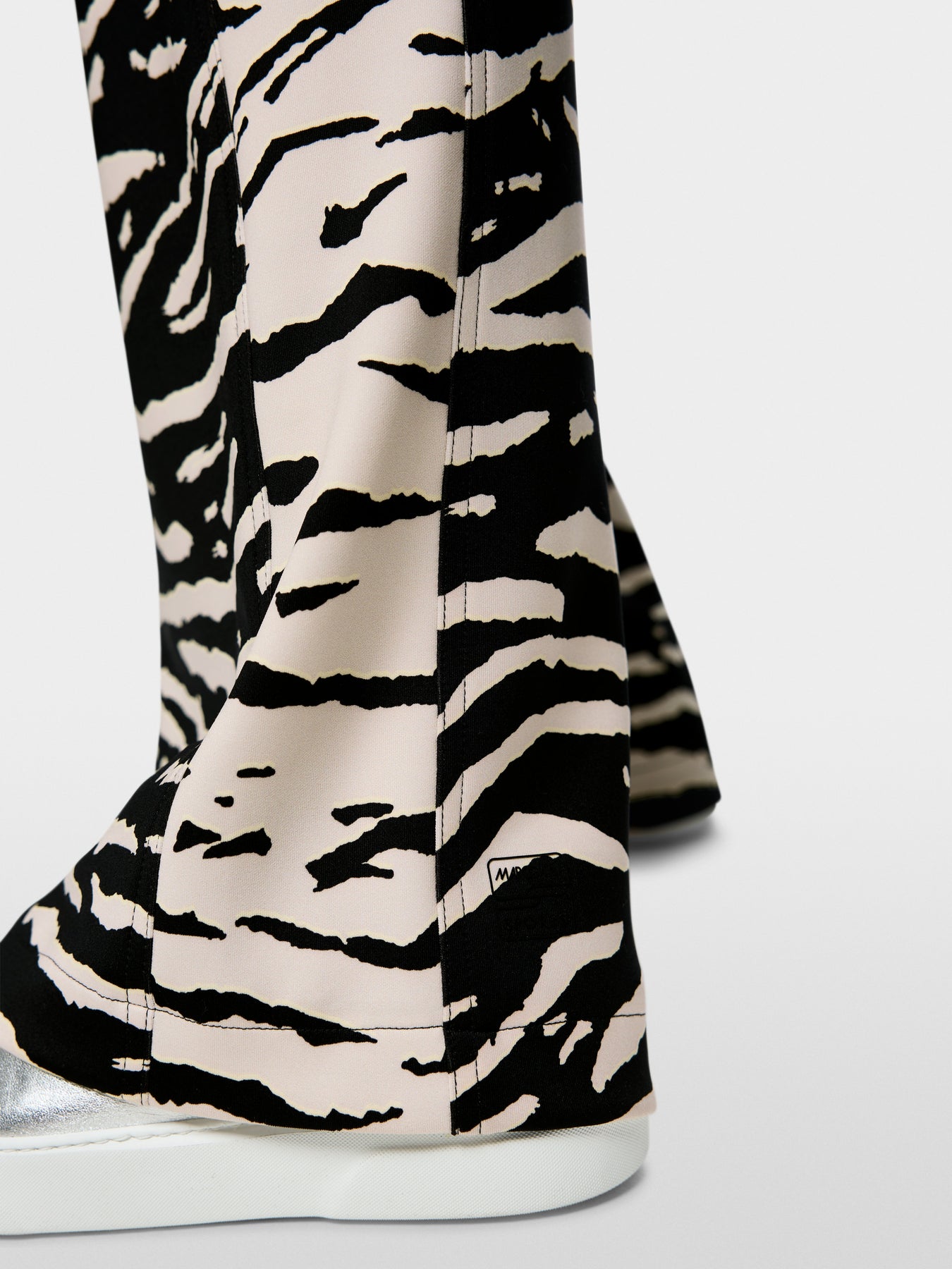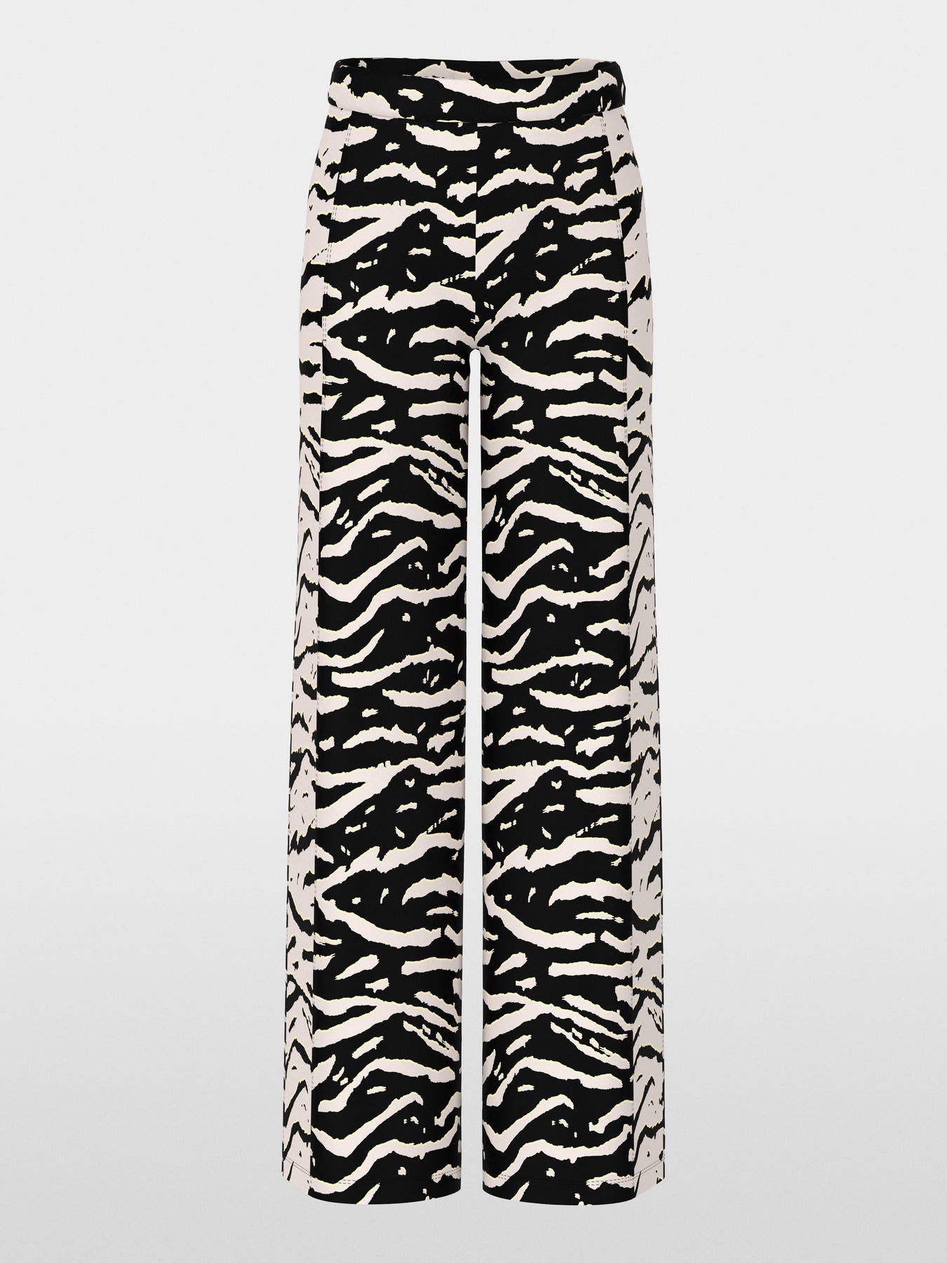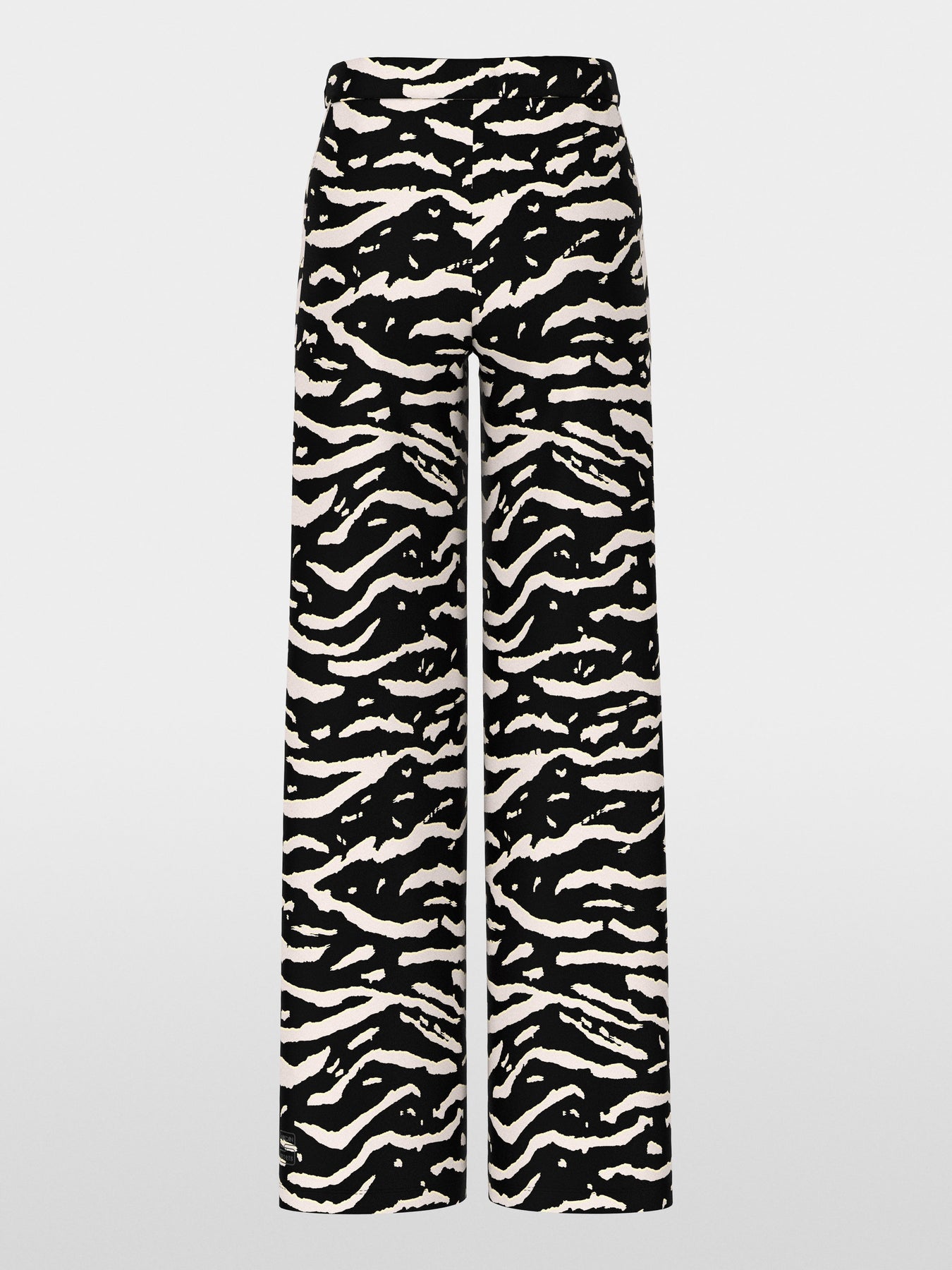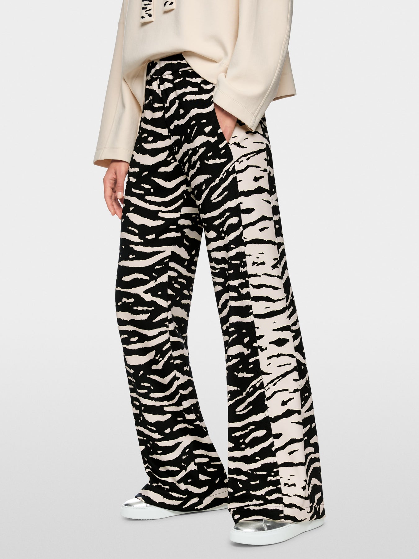 Superlekker bukse med lange vide rette ben, strikk i livet og lommer i siden. Spennende zebramønster i sort og beige.