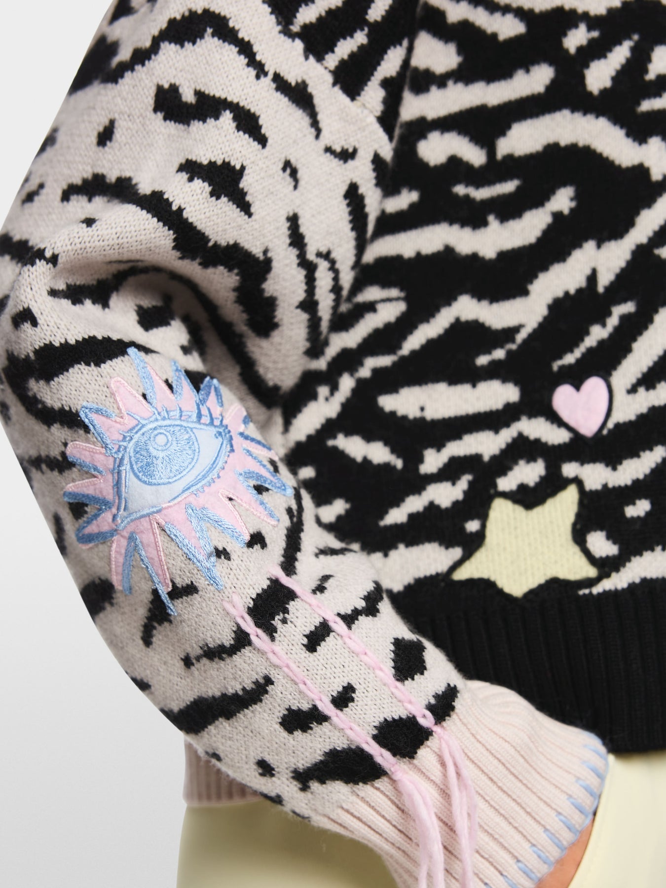 Rålekker strikkegenser i nydelige farger med spennende detaljer og zebramønster. Delikat pudderfarge med sort, lys blå og rosa detaljer