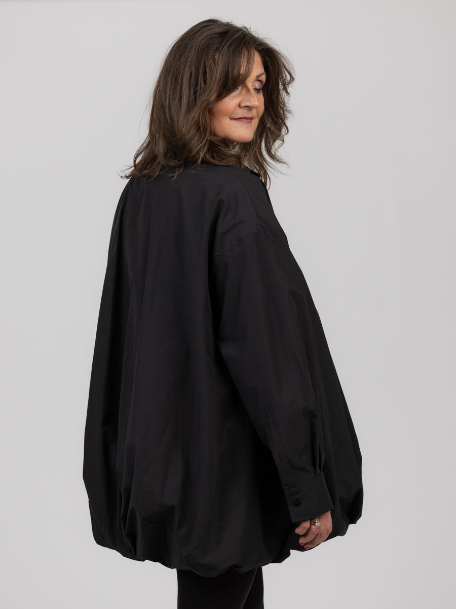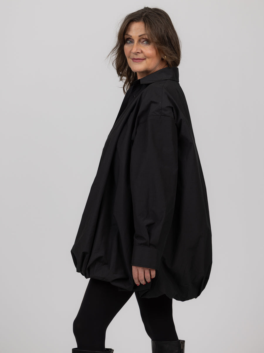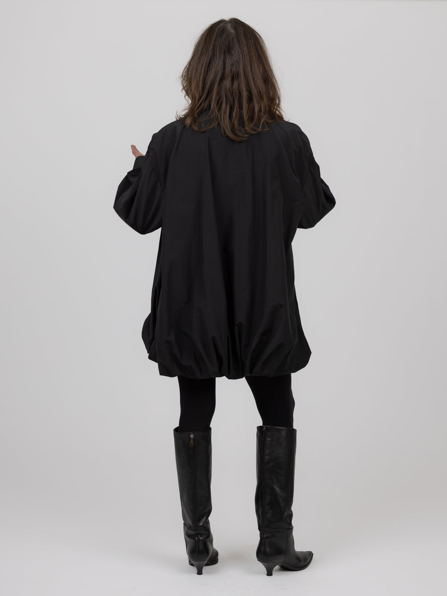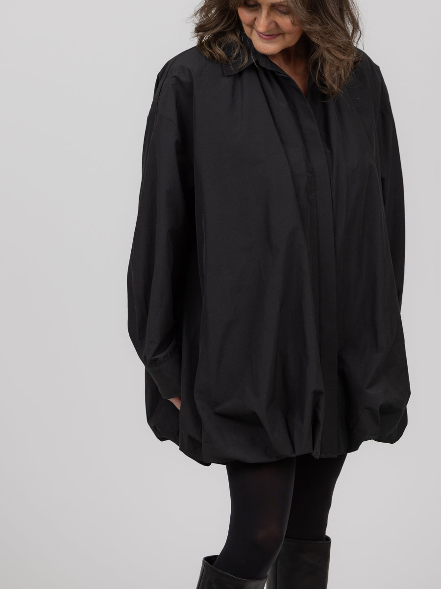 Superfin oversized kort skjortekjole fra vårt nye merke ELEH! Sort med knapper foran hele veien, den har en ballongfasong som gjør den helt spesiell. Lengden vil variere etter din høyde, men går til ca ovenfor kneet.