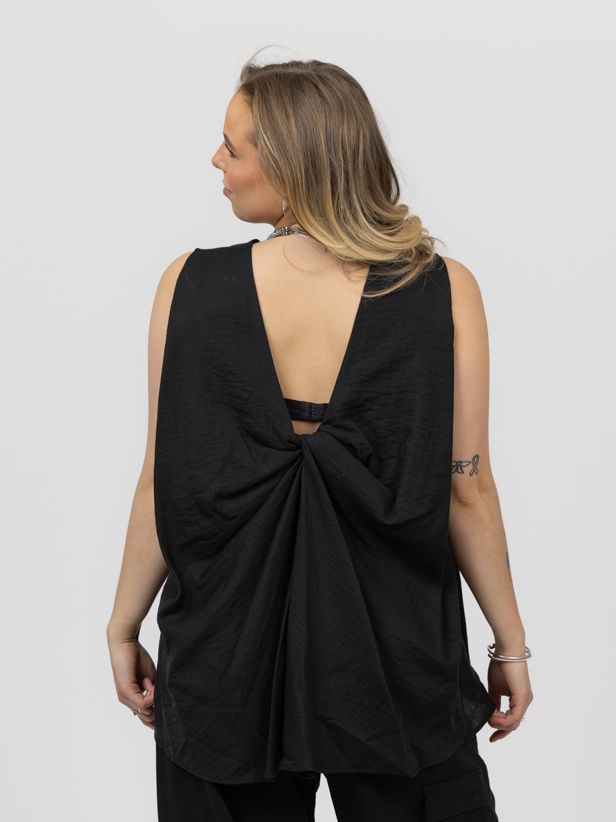 Superfin topp fra vårt nye merke ELEH! Sort lett og delikat kvalitet, enkel rund hals foran, utringning bak med knute - uten arm og med et løst og ledig snitt. Litt lengre bak enn foran.