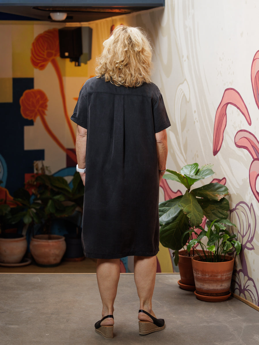 Det er korte ermer med oppbrettet kant, to brystlommer foran, og lommer i sidene.