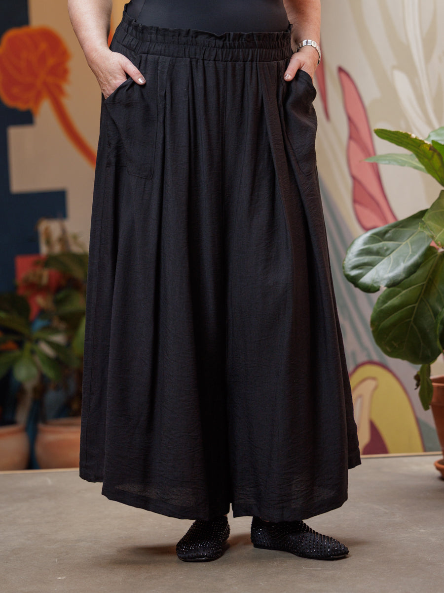 Herlig vid bukse, den er som et bukseskjørt, med strikk i livet og lommer i siden.