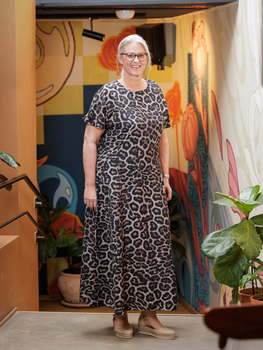 Lang leopardkjole i myk og deilig kvalitet med lett figursydd snitt. Rund hals med knapp bak, med kort arm. Kjolen skrår litt ut nederst, går til ca ankelen.