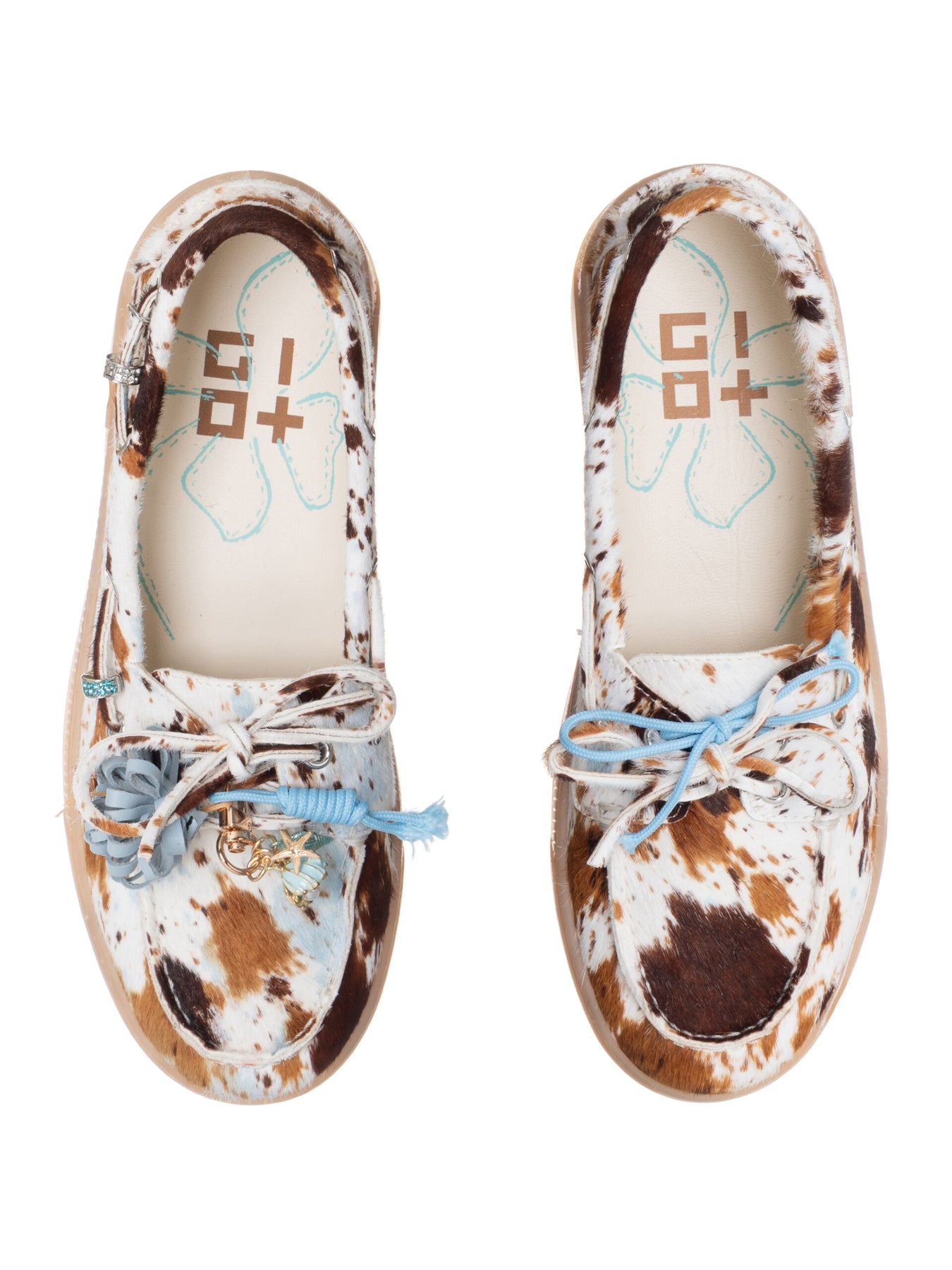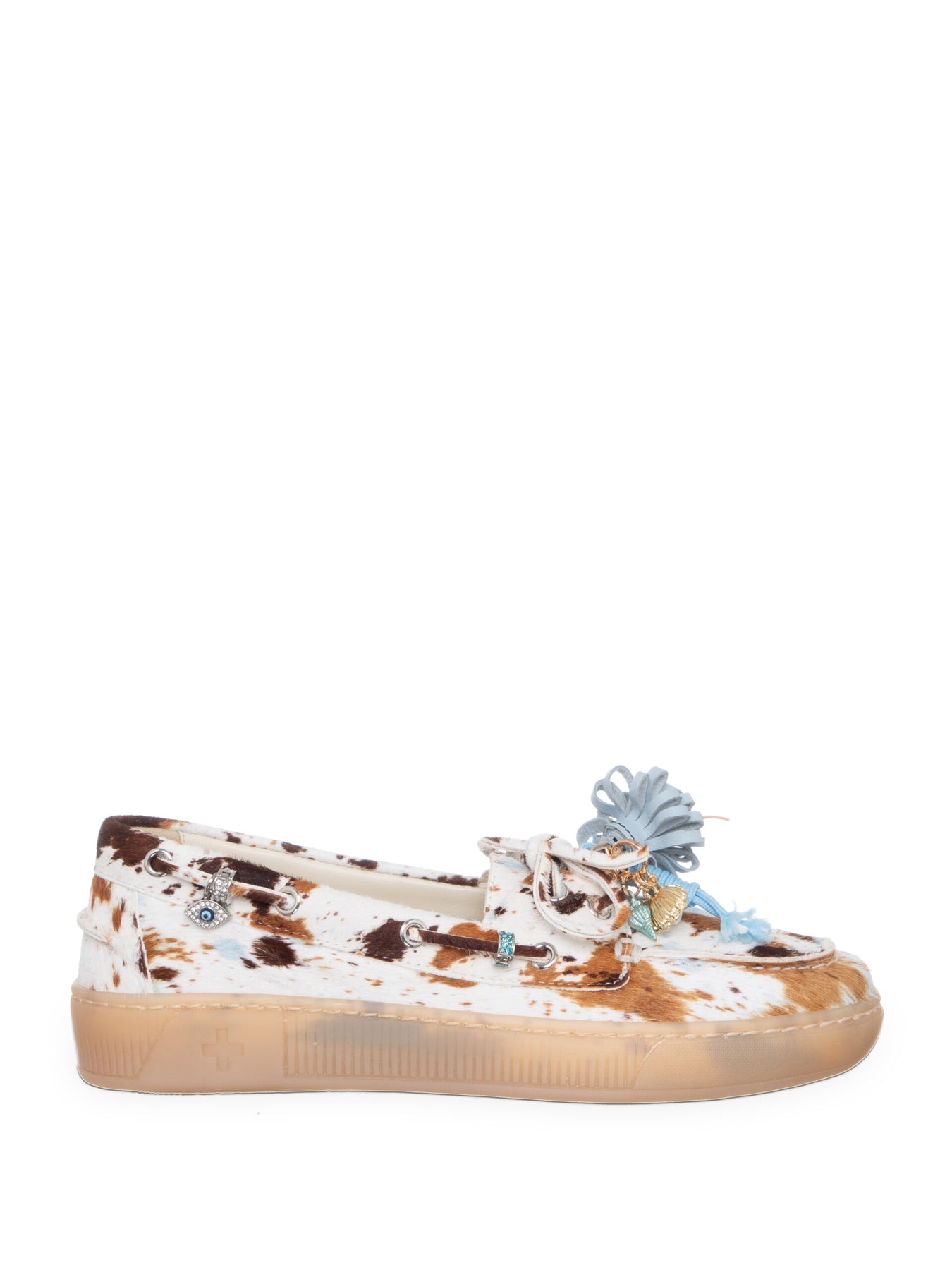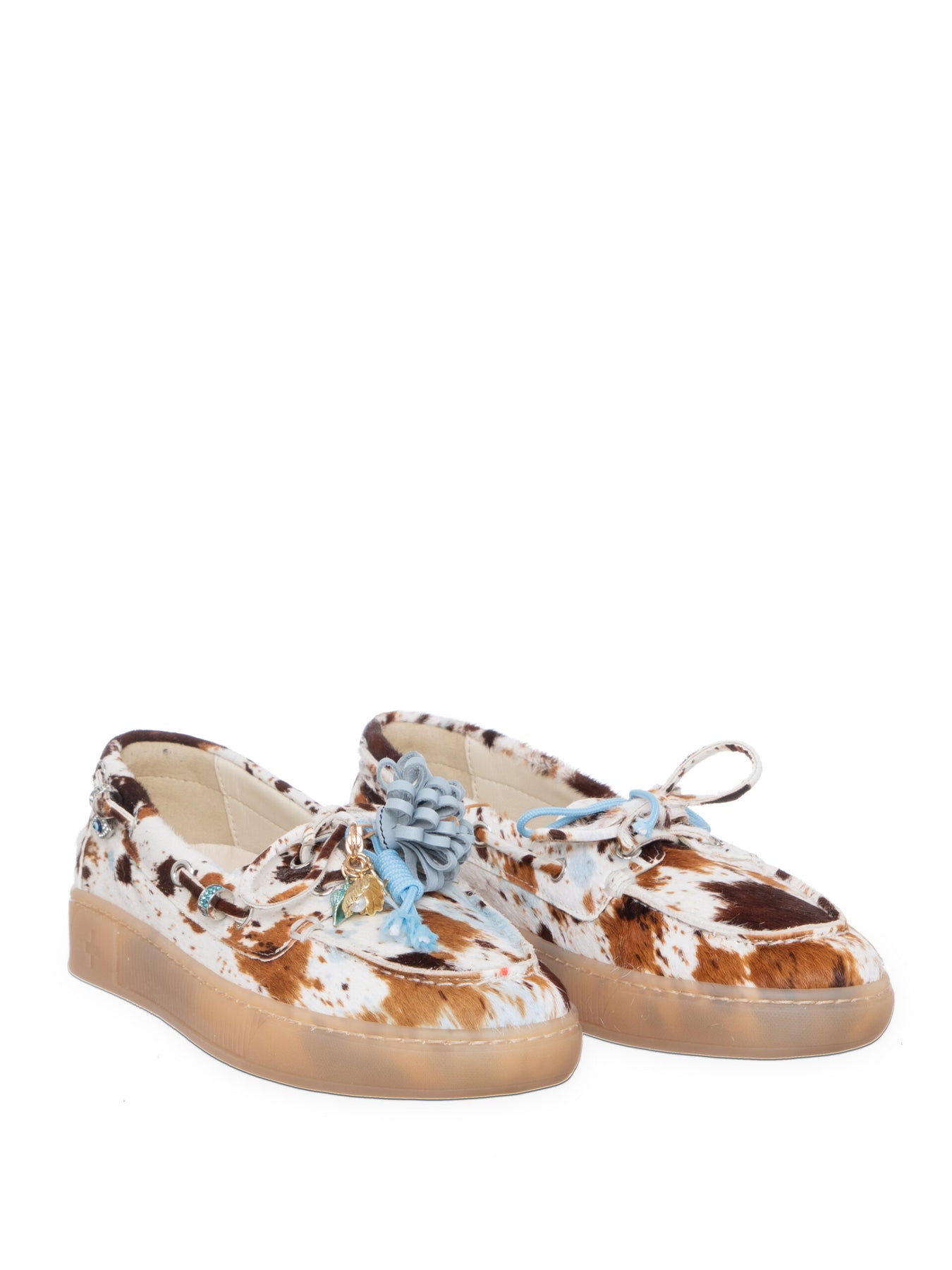 Superlekker og helt spesiell ny loafer - med kuprint og lyseblå detaljer. Snøring rundt slik at den kan strammes litt. Strasspynt og charms som er avtagbar. Myk og lett gummisåle.