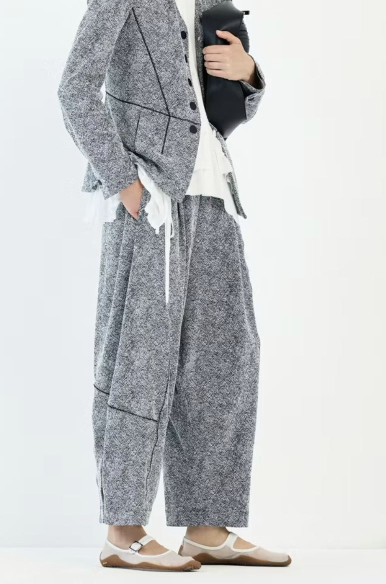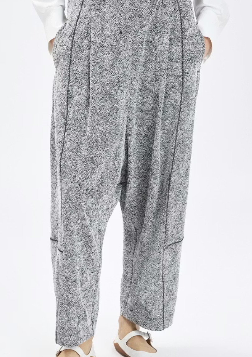 Buksen har linning, glidelås foran og lommer i siden - den smalner litt inn nederst på bena - går til ankelen.