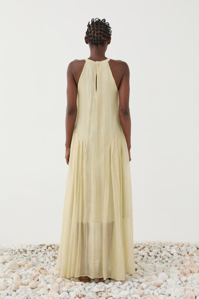 En sofistikert ermløs maxikjole med høy hals og halterneck-fasong, i en lett kvalitet. Kjolen har en nydelig a-fasong med søm i sidene av midjen, og underkjole.