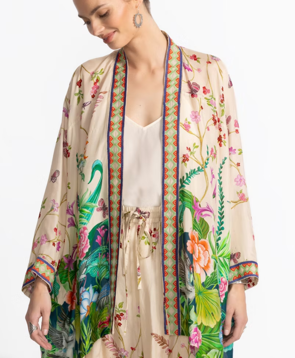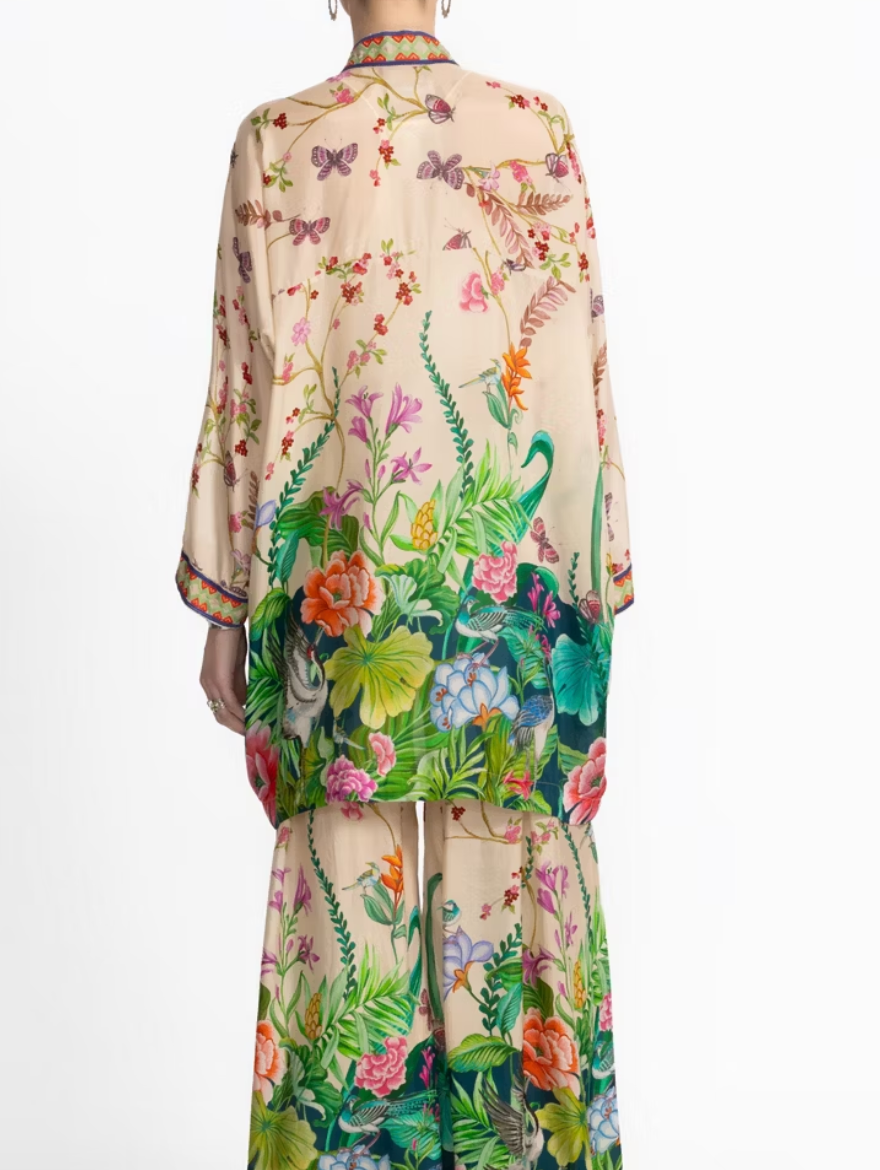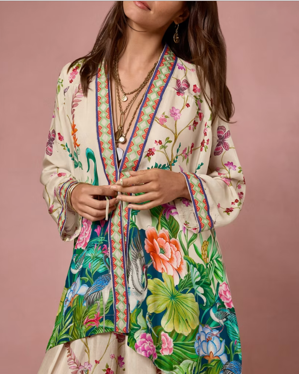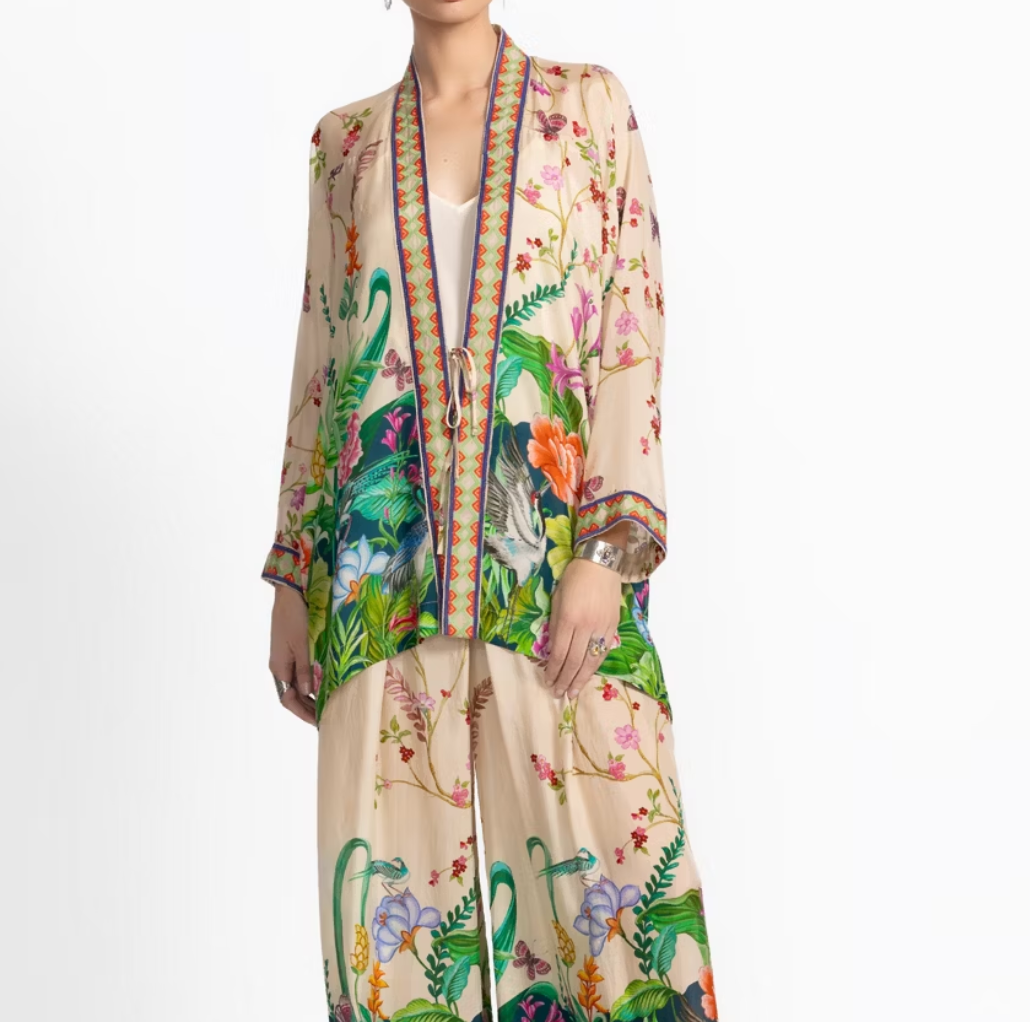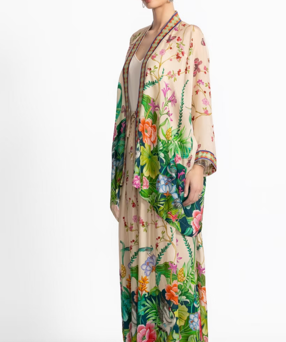 Denne Kimonoen har en sommerlig look som gjør seg til enhver anledning. Så vakker og unik print! Kimonoen er også laget av 100% silke som gjør den fantastisk å ha på seg.