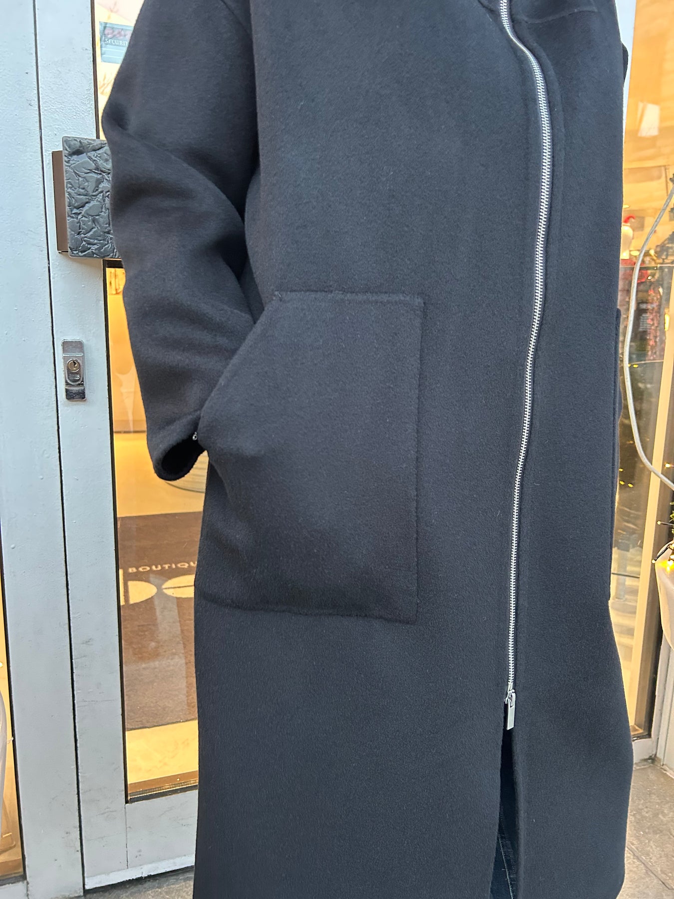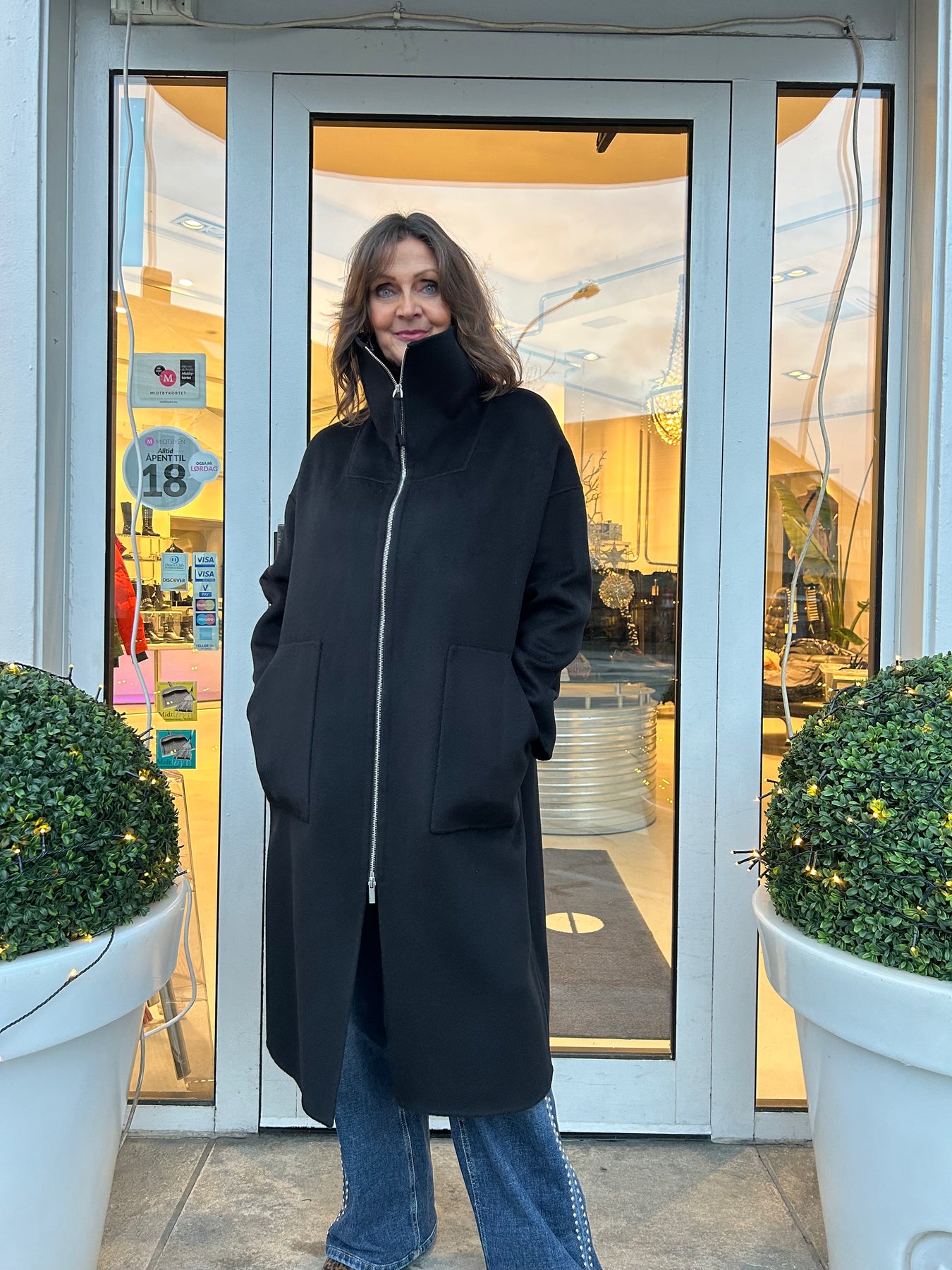 Nydelig lang sort ullkåpe med glidelås foran og høy krage, lommer i front. En lekker kåpe i nydelig lett og myk kvalitet. Dobbelglidelås slik at den kan åpnes også nedenfra.
