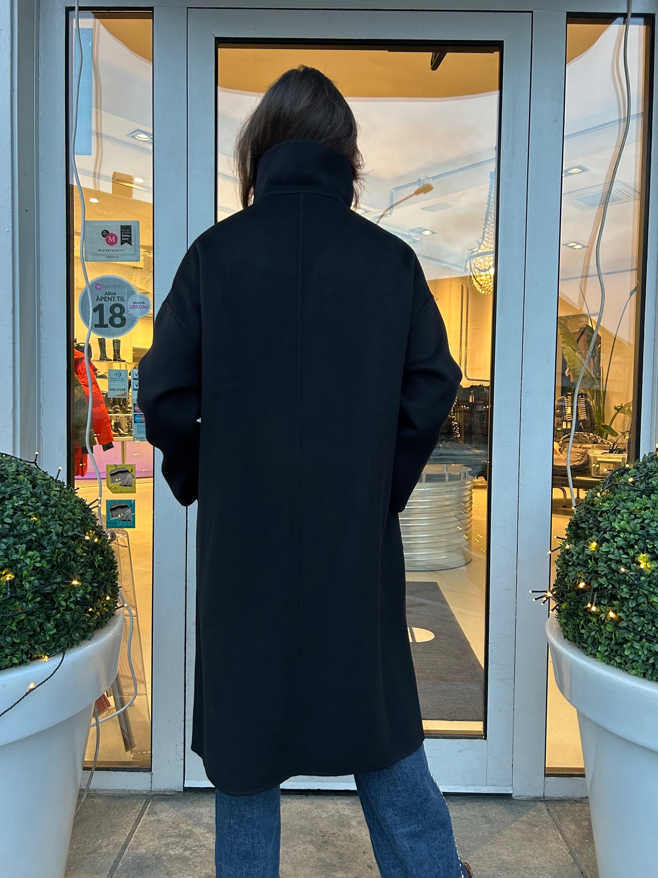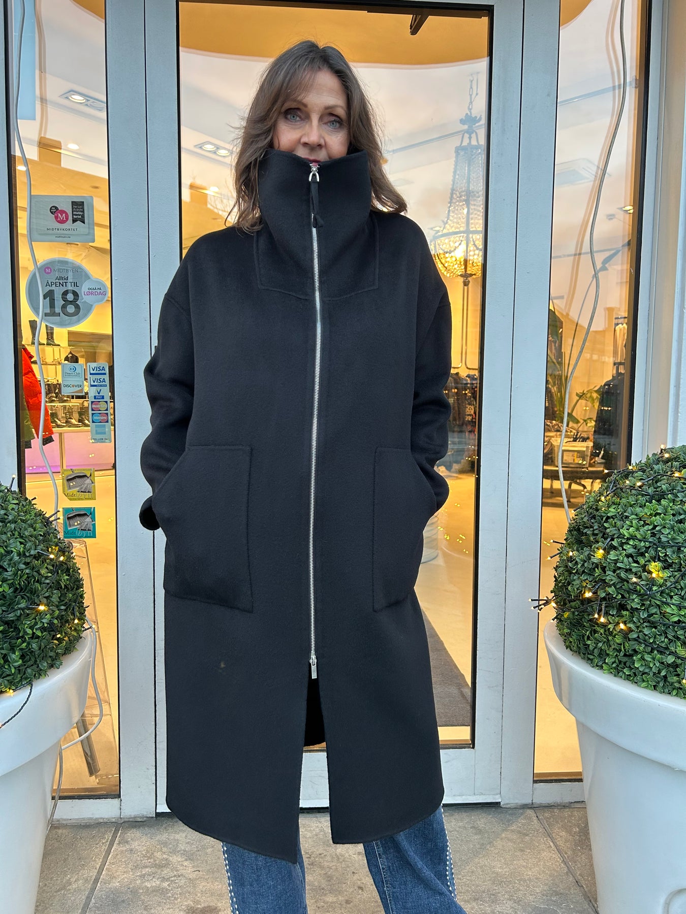 MEIMEIJ Sort lang ullkåpe med glidelås foran og høy krage