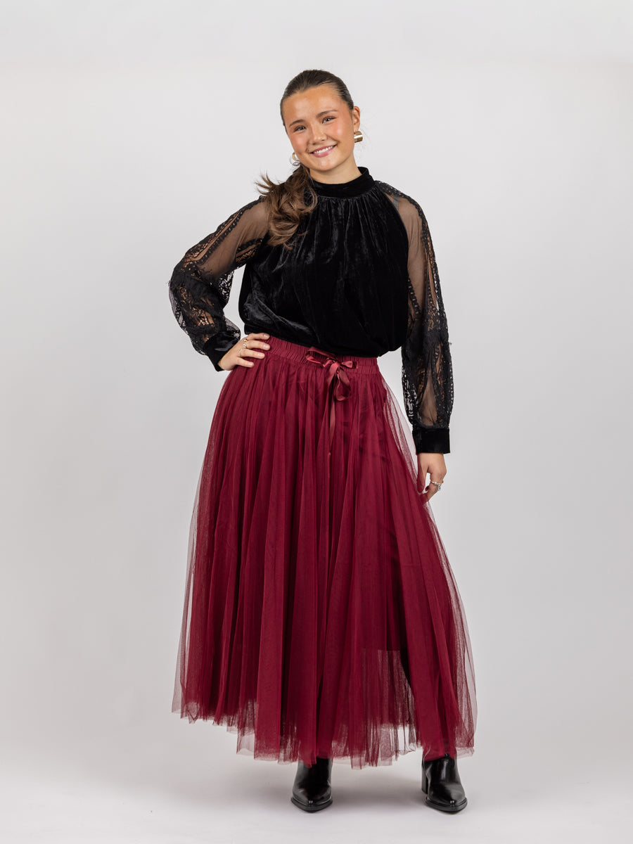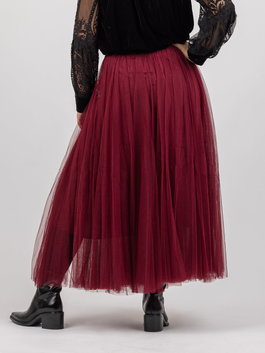 Lekkert tyllskjørt i burgunder med strikk i livet og snøring foran. Sitter flott på, går til ankelen.