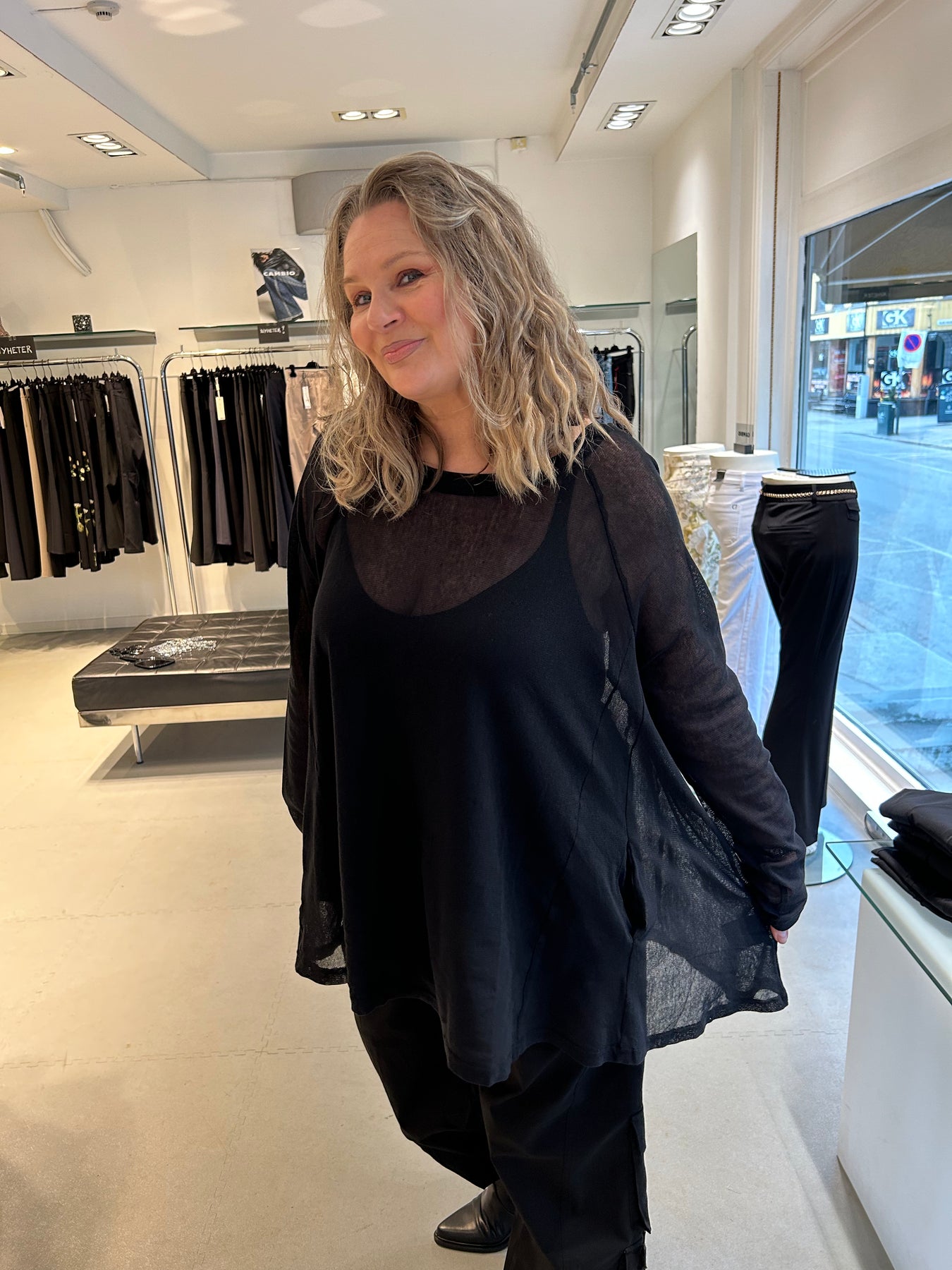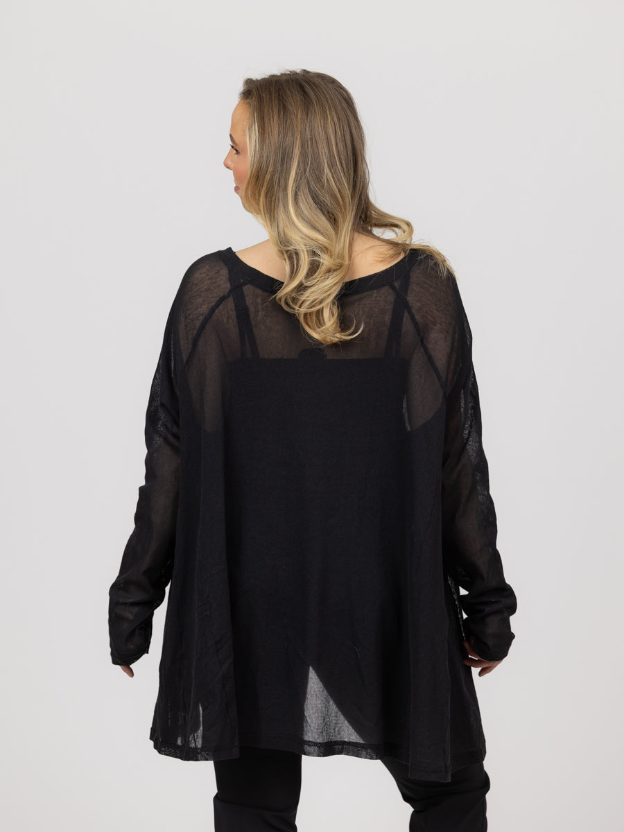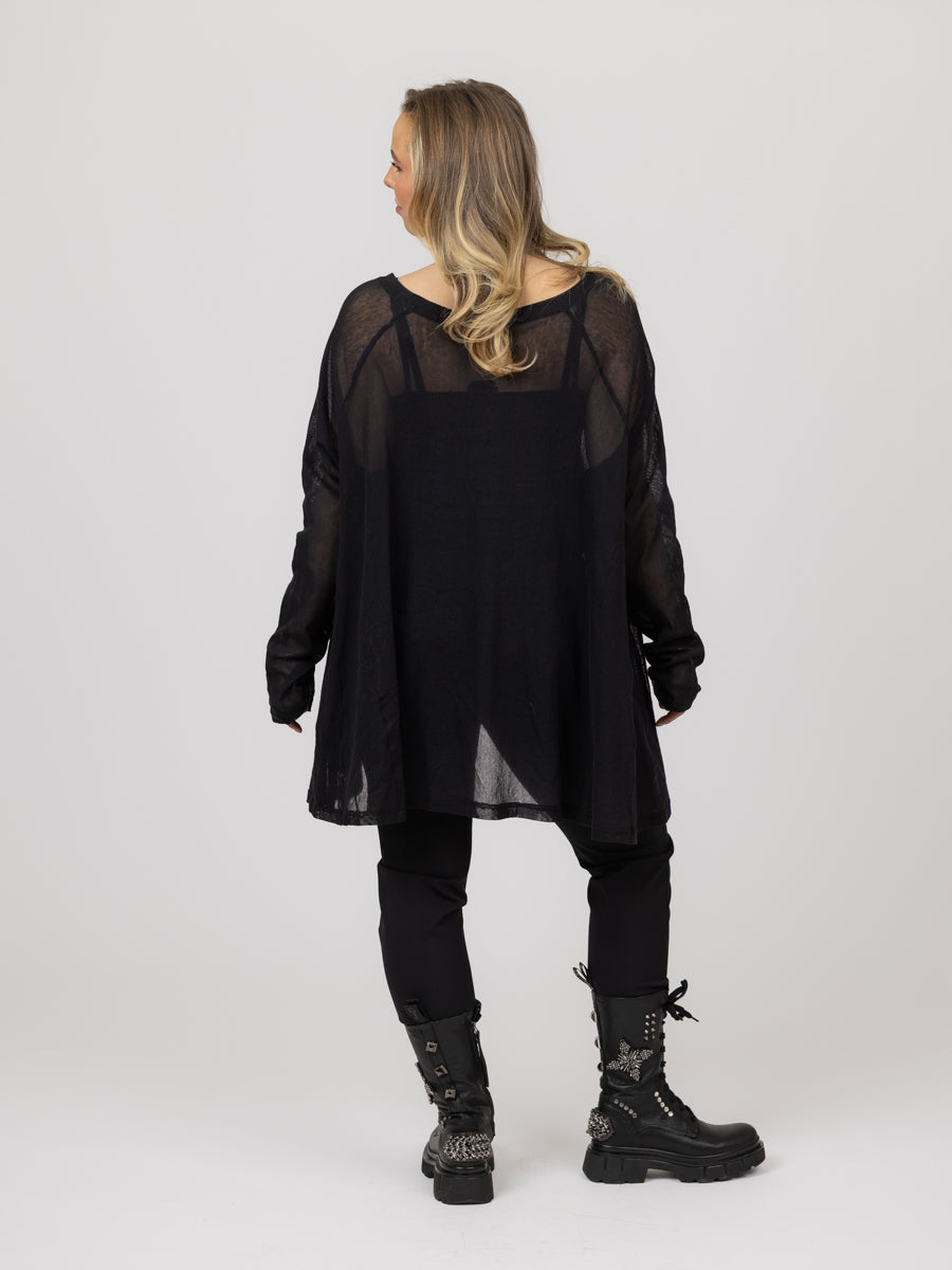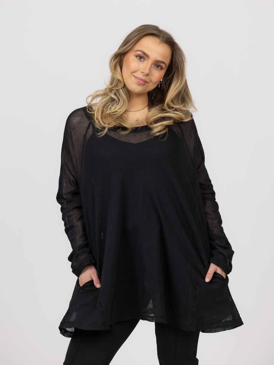 Nydelig mesh topp. Lang topp med lange ermer, lommer i siden og en flatterende passform.