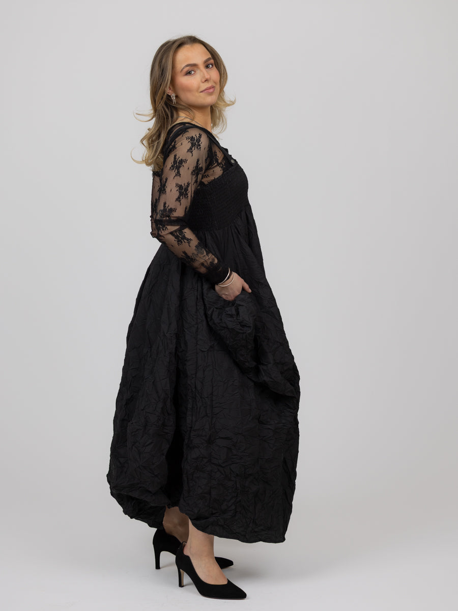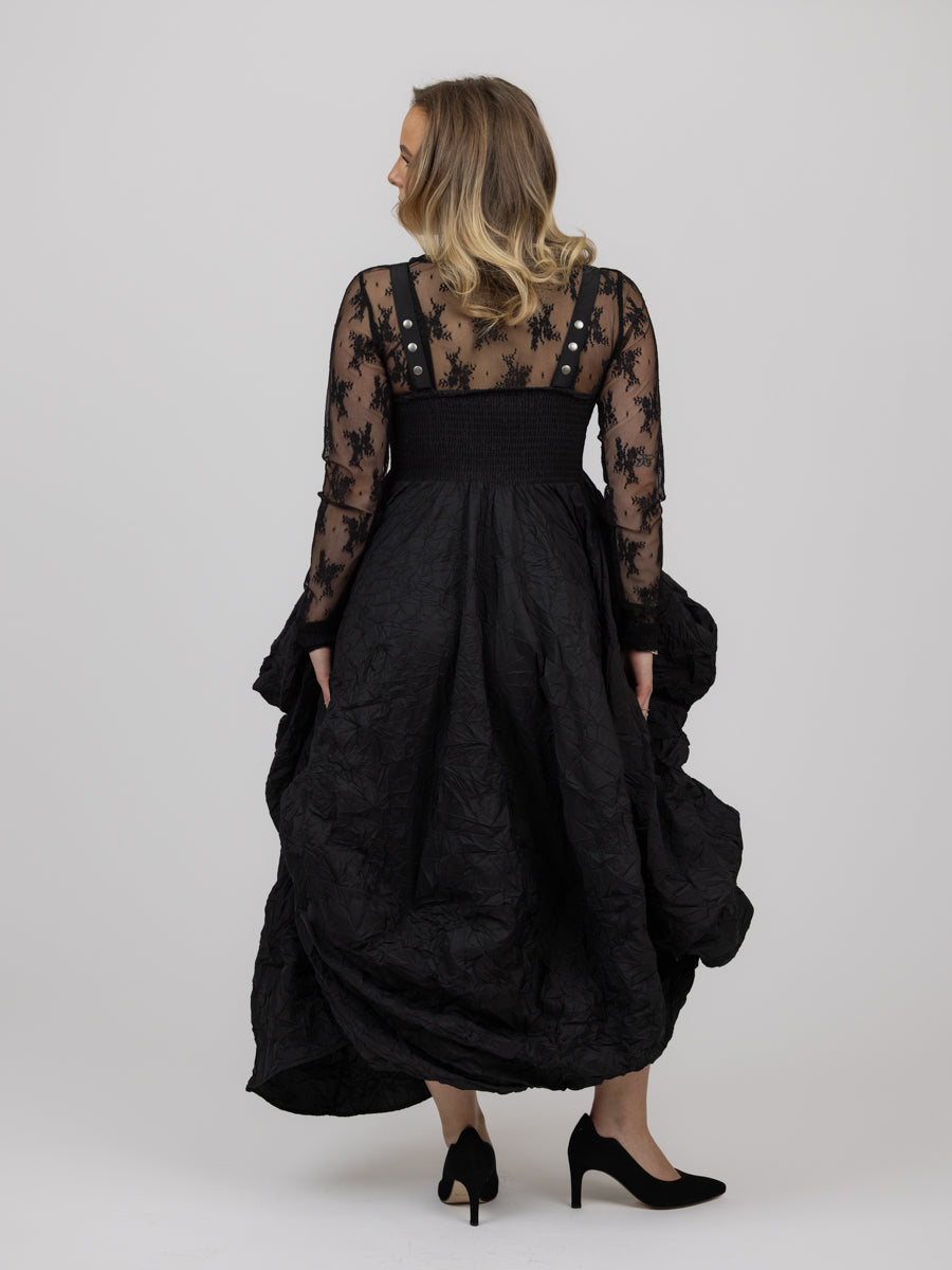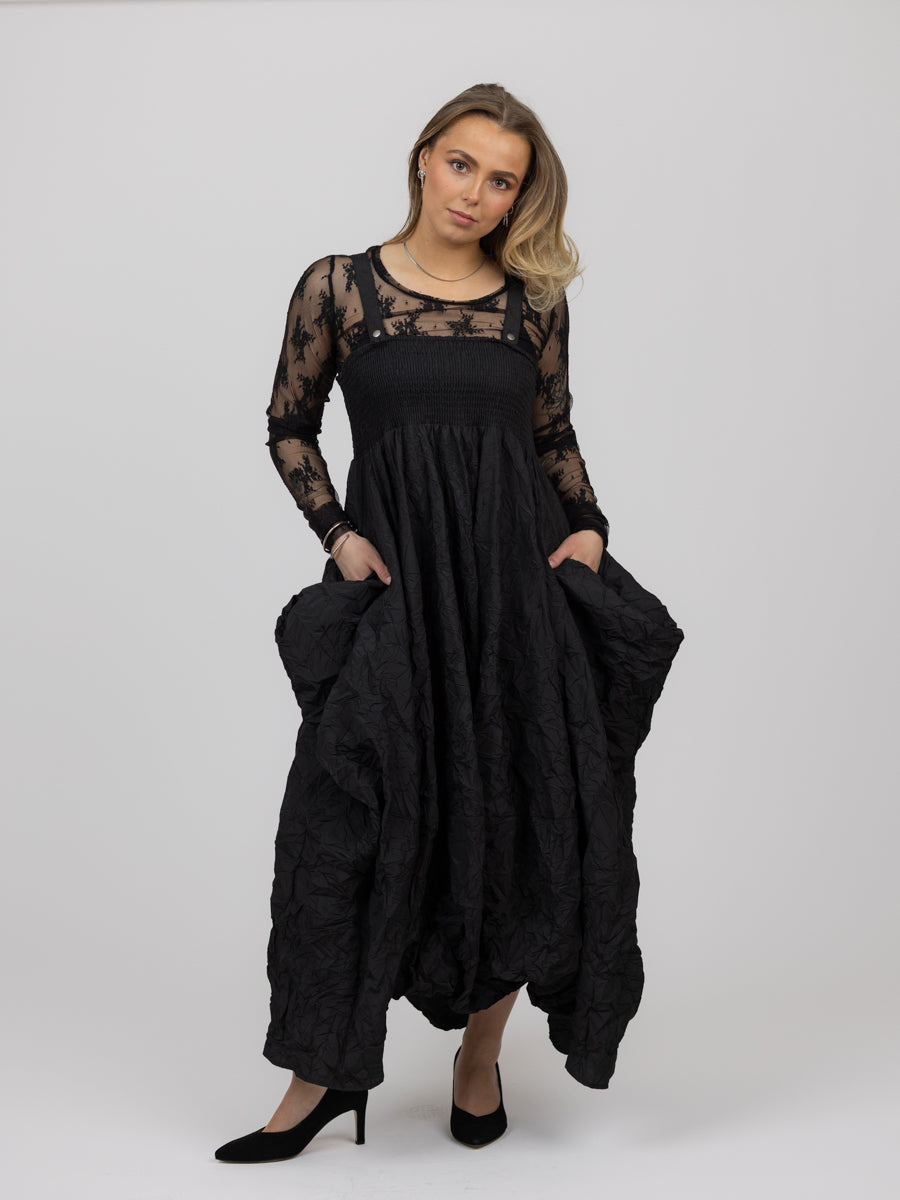 Rålekker kjole med et asymmetrisk snitt. Selestropper som kan reguleres. I en lett og ledig kvalitet. Perfekt for varme dager, eller en god fest. Går til litt under kneet.