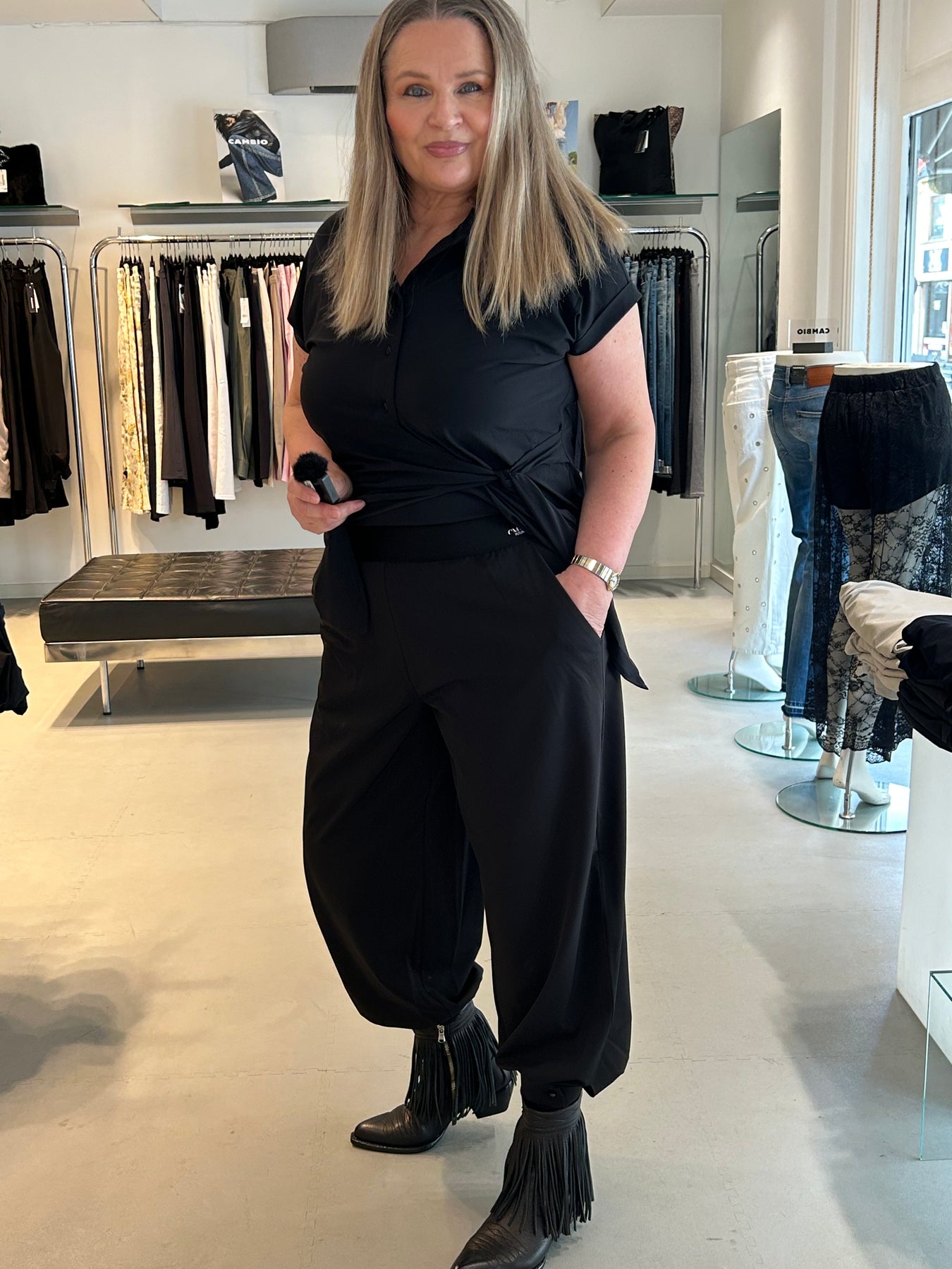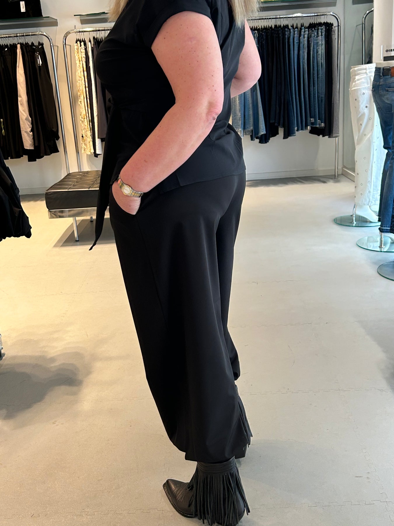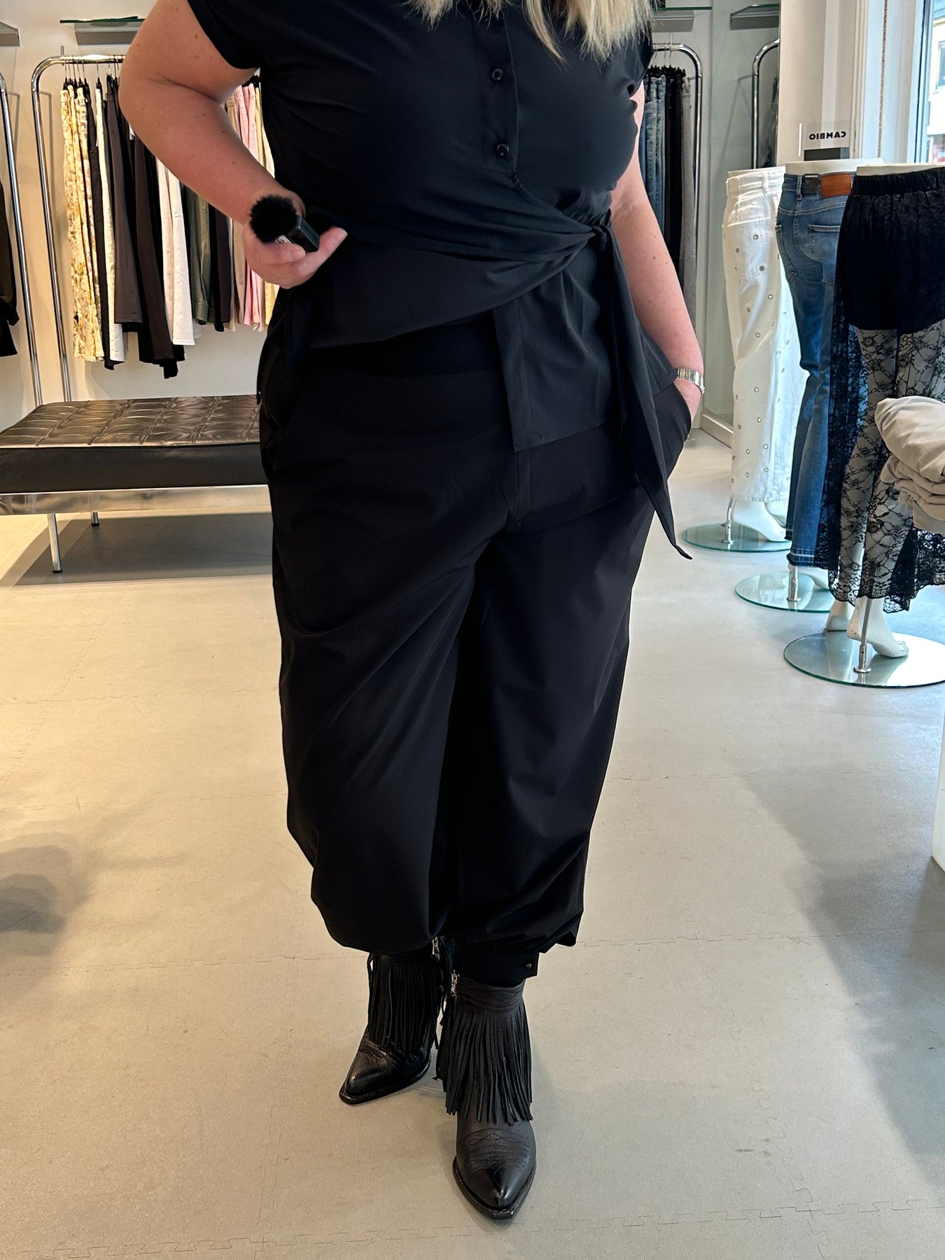 Blanche har en superstretchy kvalitet og ballongfasong som gir et helt unikt og nytt uttrykk. Mansjett kant nederst på begge ben som kan lukkes opp og igjen med knapp. Strikk i livet og lommer i siden, går til ca ankelen.