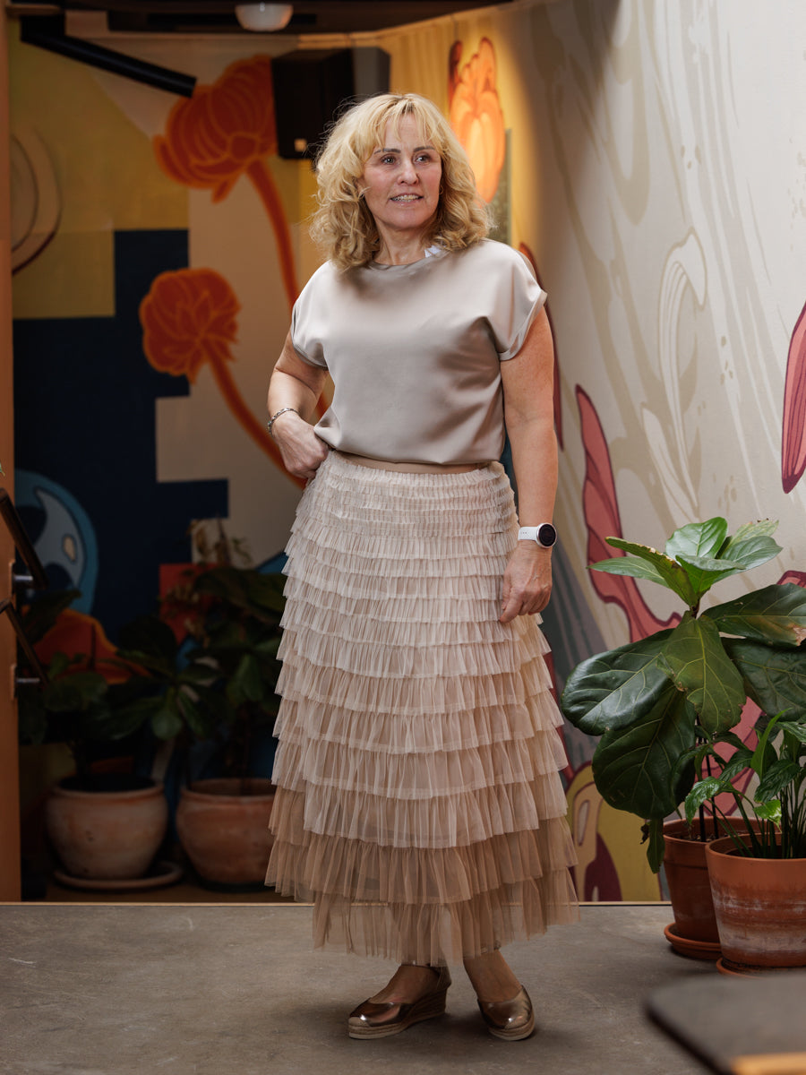 Blank og lett kvalitet, med rund båthals og kort arm. Toppen kommer i denne champagnefargen, sort og perlegrå. Kjempefine å ha under dressjakke eller cardiganer også.