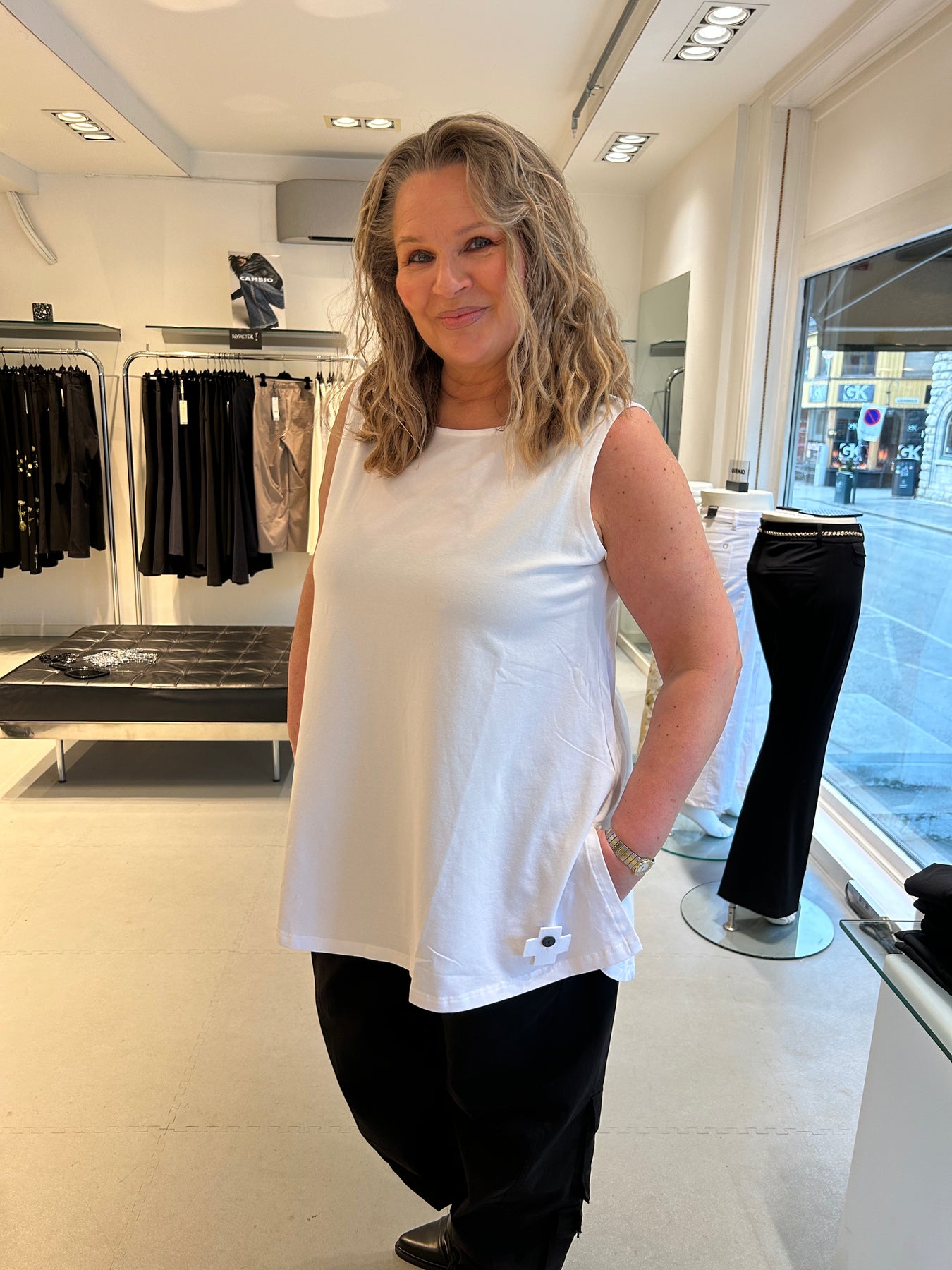 Fantastisk basis topp. Hvit uten arm. Utrolig myk, stretchy behagelig. Litt lang med en nydelig A-form.