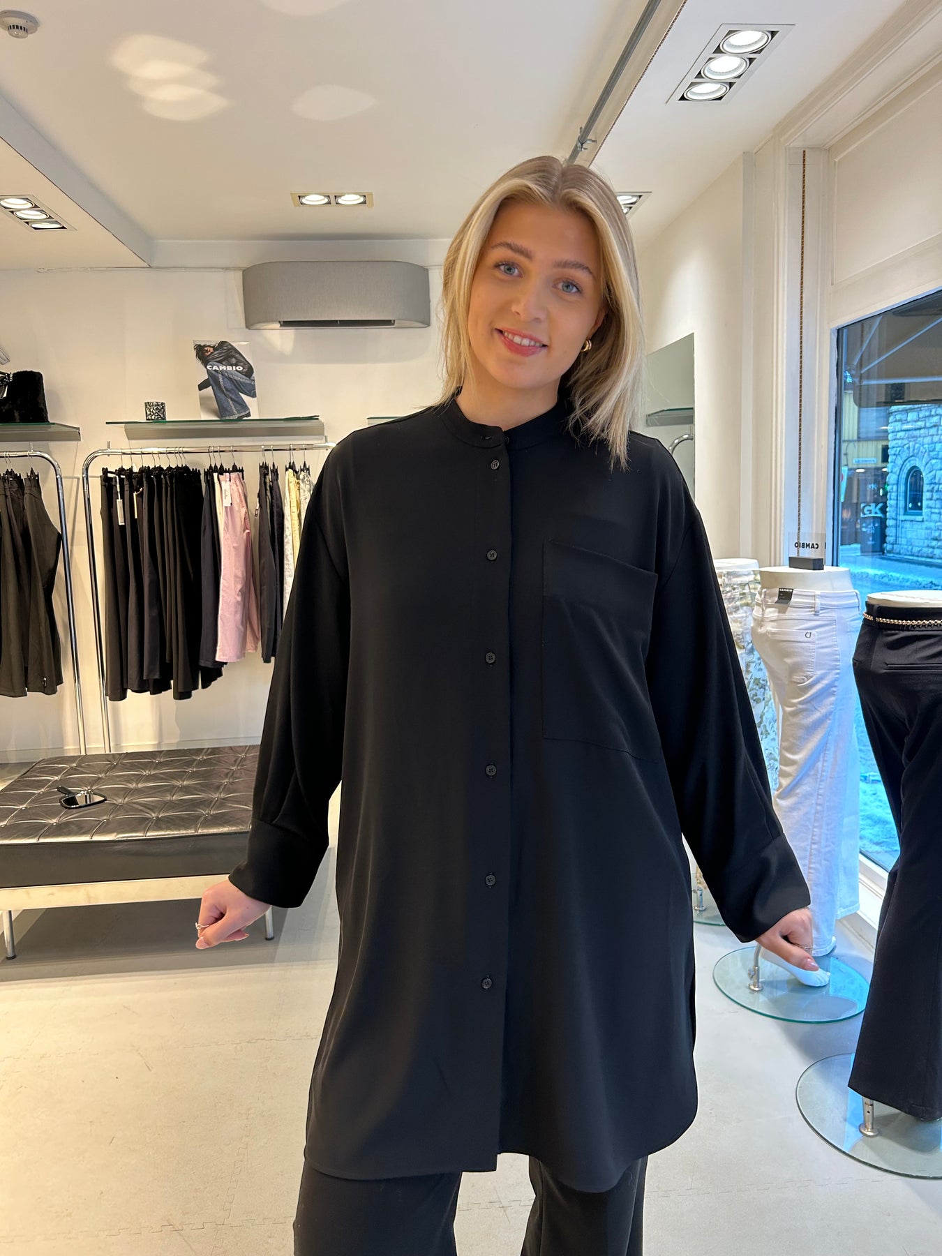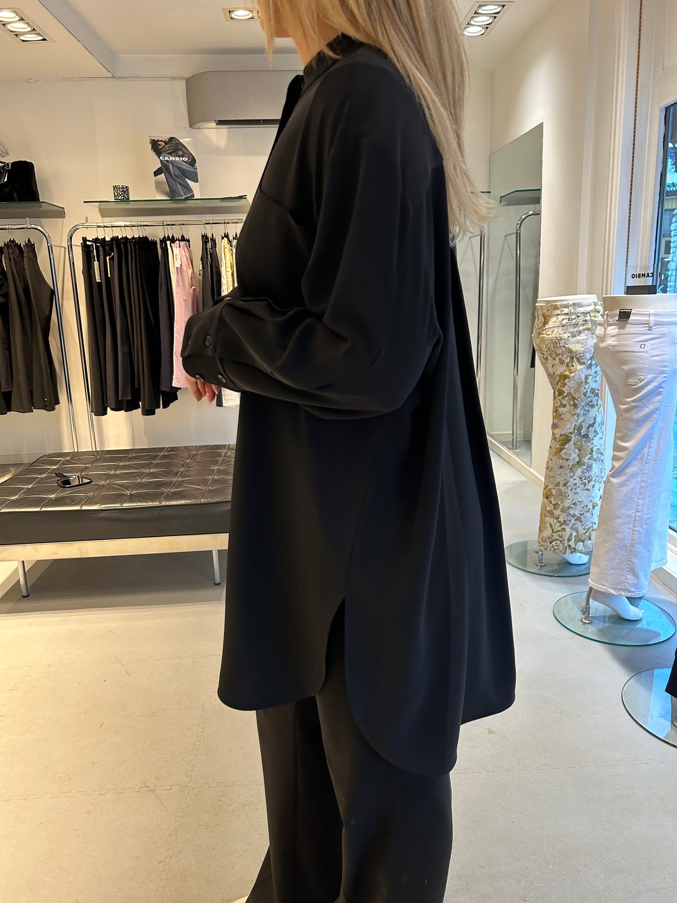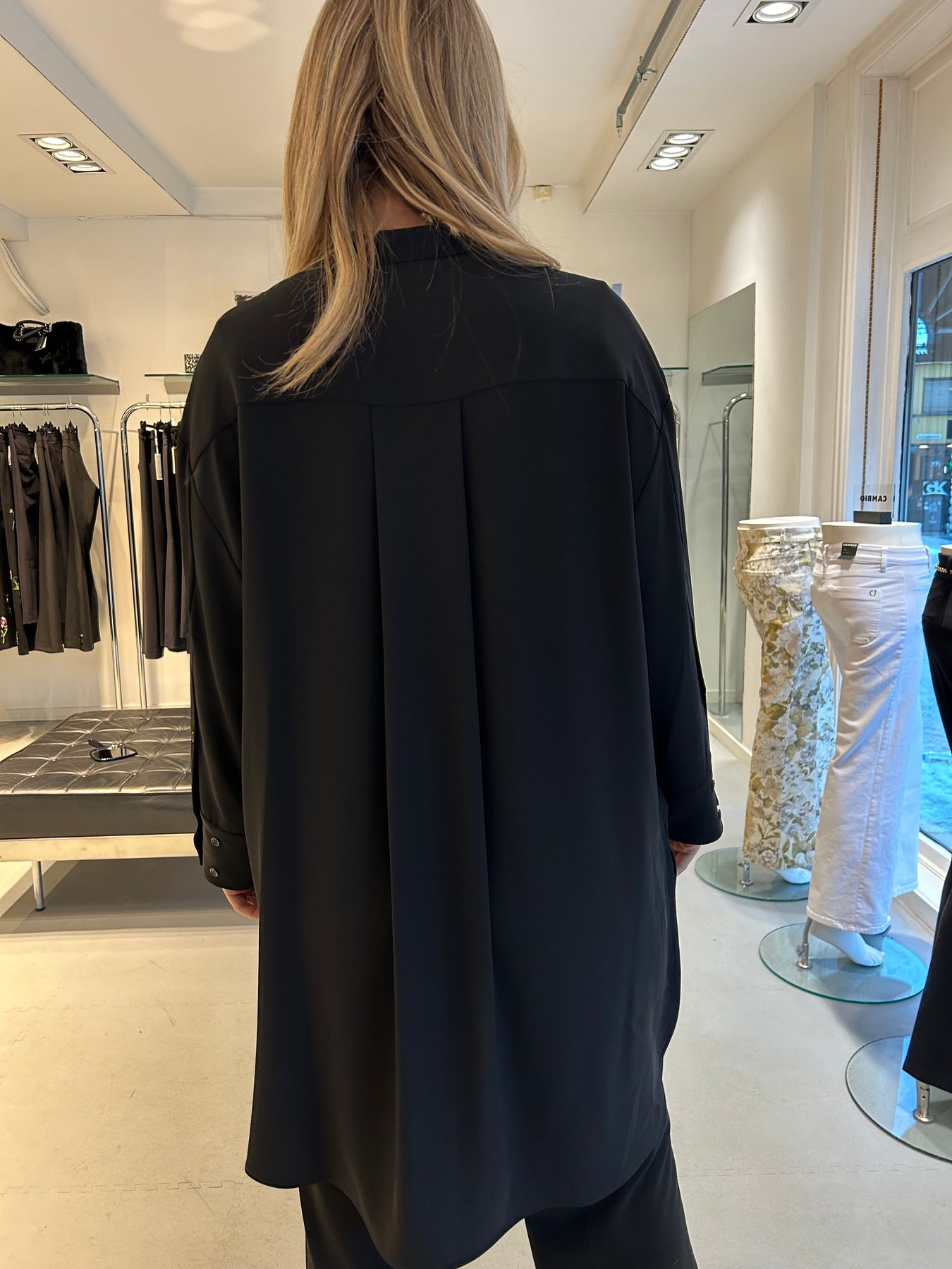 Eksklusiv sort skjortekjole, lett oversized, med knapper foran og splitter i sidene. Går til ca ovenfor knærne. Rålekker kvalitet, myk med litt tyngde slik at den faller perfekt.