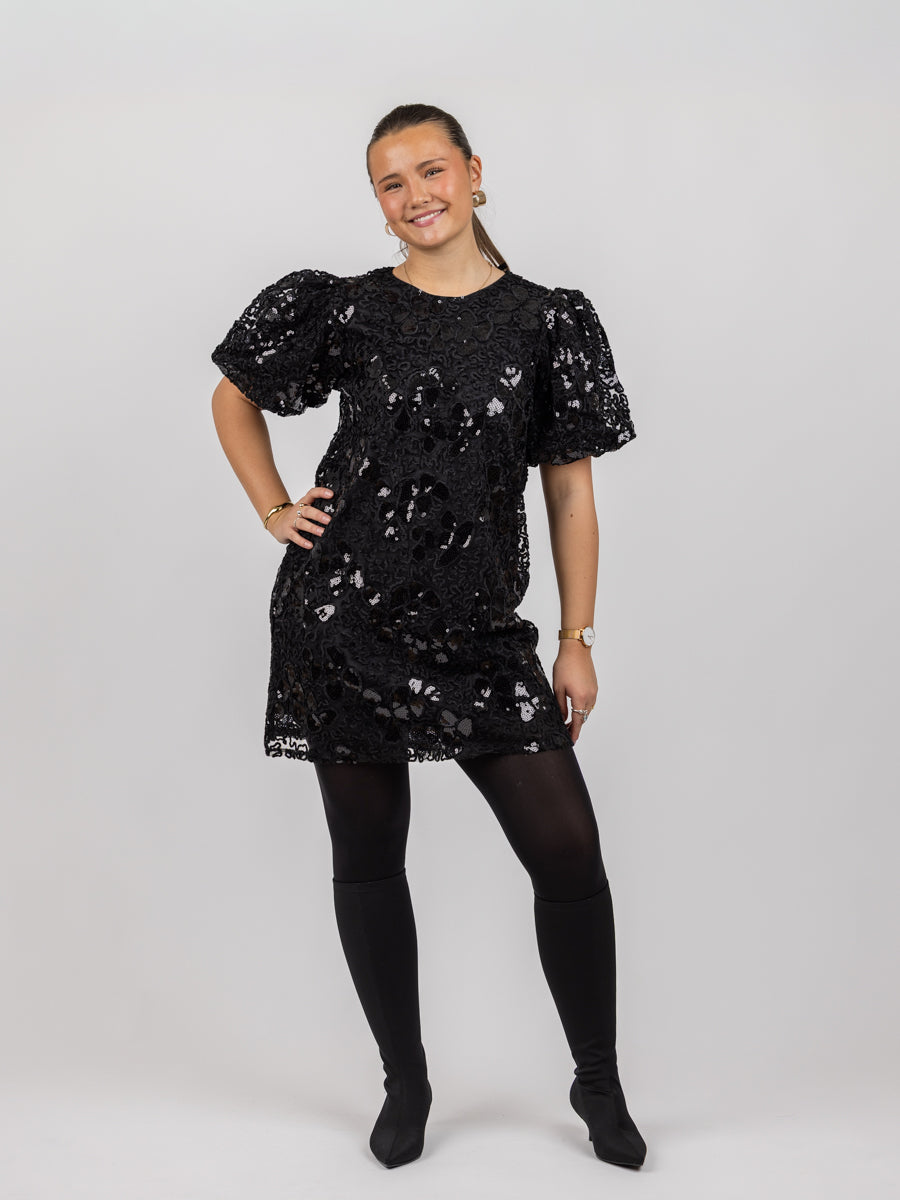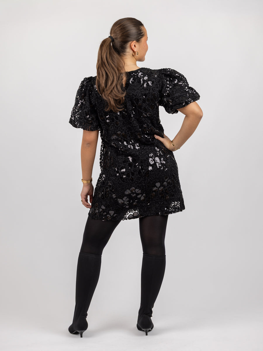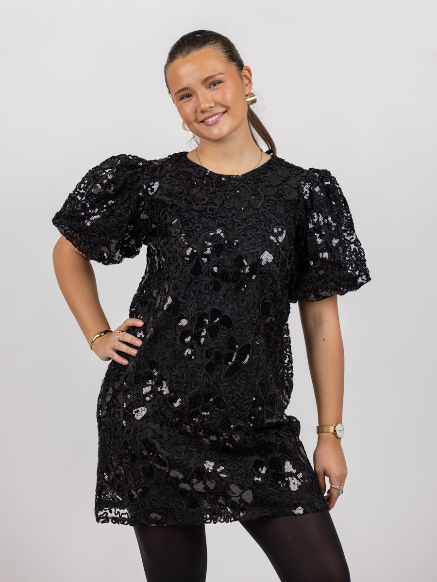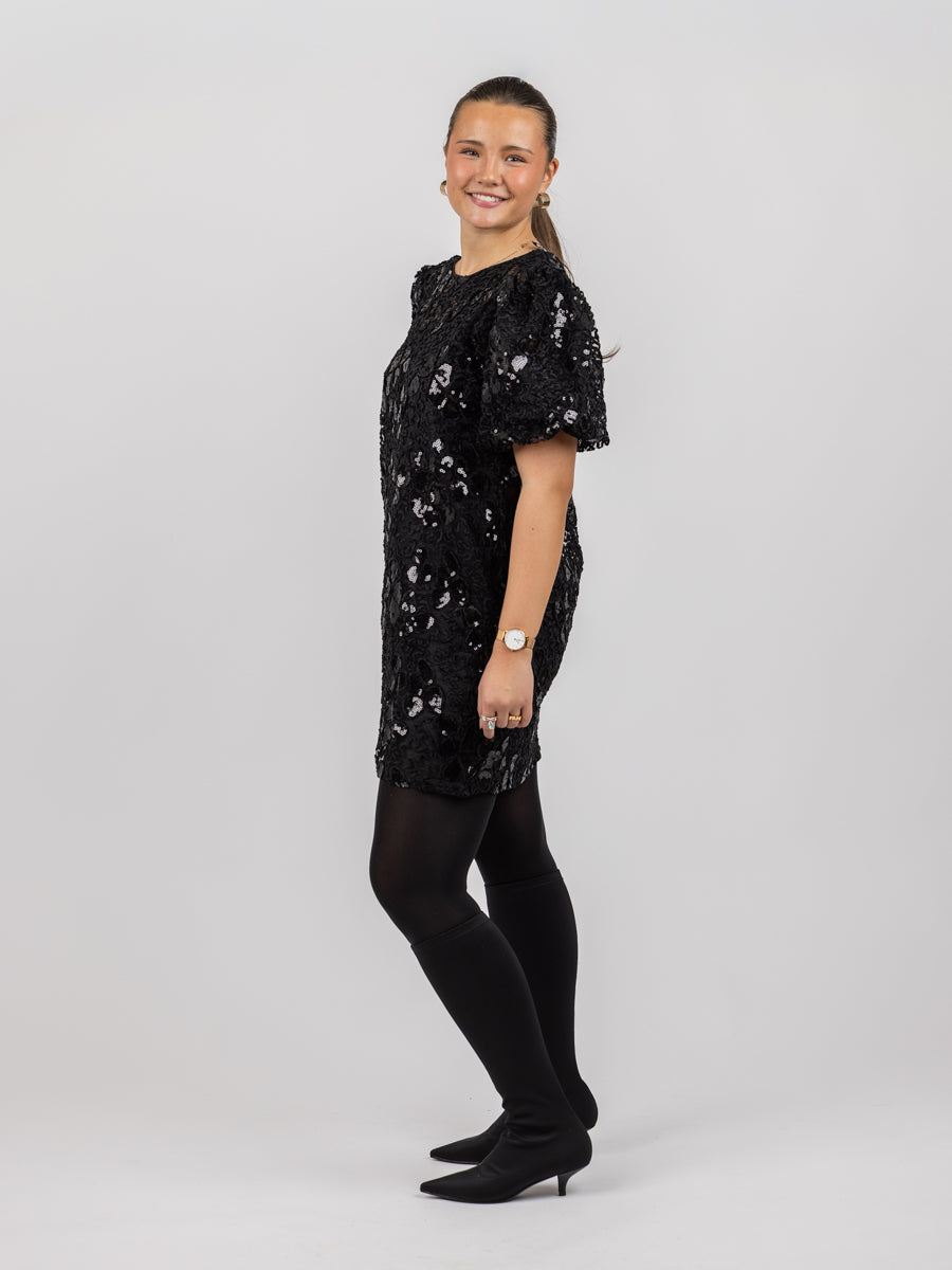 En fantastisk kjole med velour- og paljettdetaljer over hele overdelen. Med kvart arm med puff i skulder. Rund hals og knepping bak. Fantastisk broderidesign. Innsydd underkjole. En medium lang festkjole som er helt unik til festsesongen!