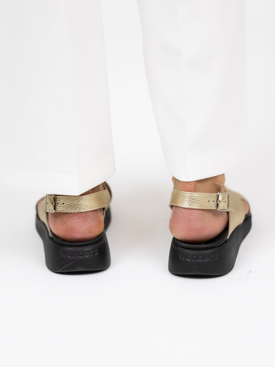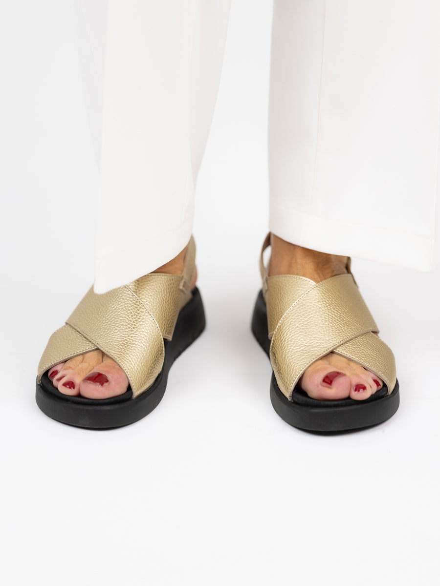 Dette er bestselger sandalen vår i gull med det lille ekstra. Den har en bred kryssrein over vristen som gjør at den sitter som støpt på foten. Man kan også justere sandalen med spennen bak ankelen. God gummisåle som er behagelig å gå på.