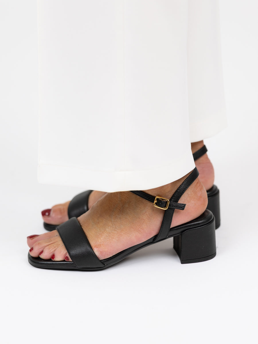 Kiala er en ny spennende modell i mykt sort skinn. Lekker sandal med rem foran, ankelrem med regulerbar spenne og ca 5 cm helhøyde. Dette er den perfekte sko til party, bryllup mm, men også kul til jeans og kjole. En utrolig flott sko til alle anledninger.