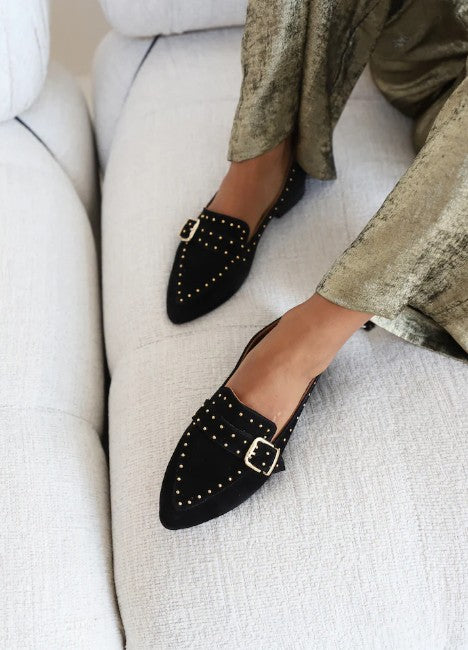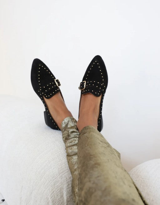 Sort spiss loafer i nydelig mykt semsket skinn. Lekre detaljer med gullstuds og spenne. Gummisåle.