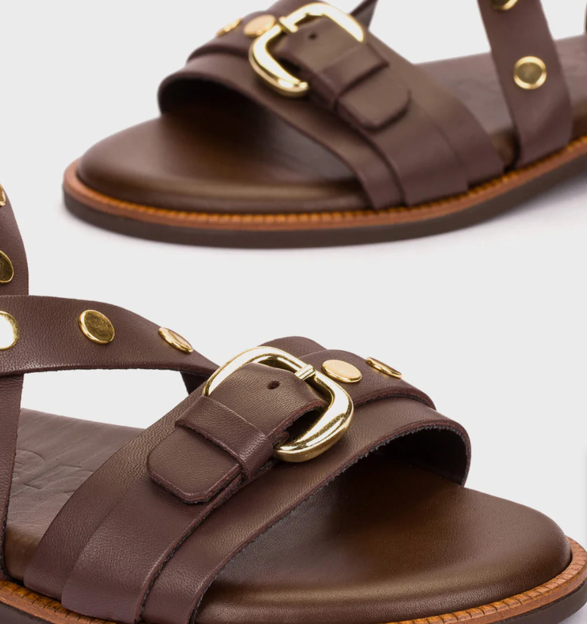 Denne råtøffe sandalen er i en mørk brunfarge og har snertne gulldetaljer!