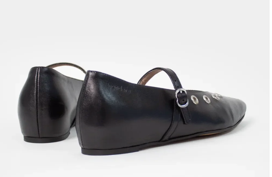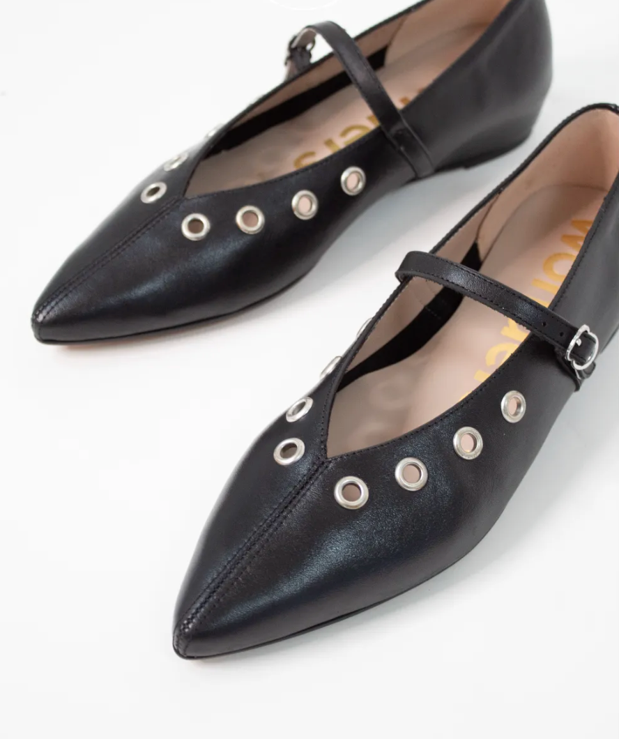 Sjekk ut denne råfine ballerina skoen, med en spiss front samt sølvringer ved vristen. Det er en justerbar reim, og god falt gummisaåle.