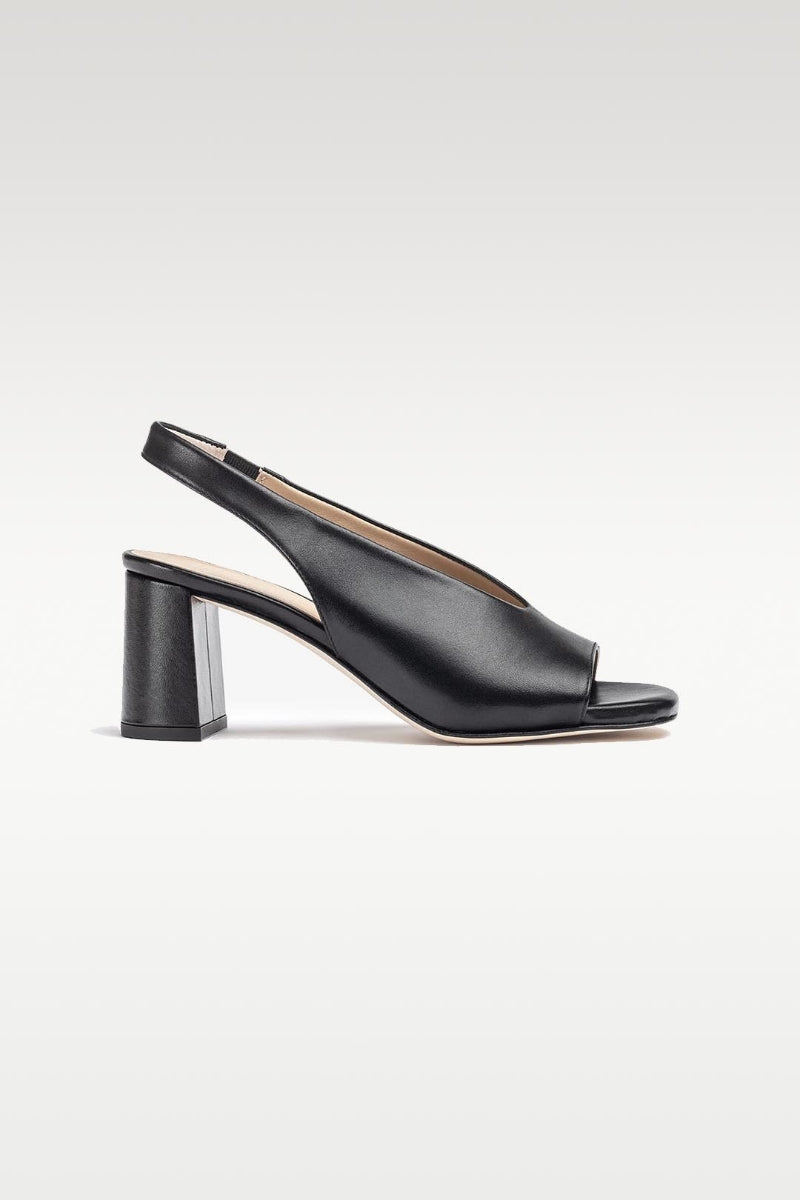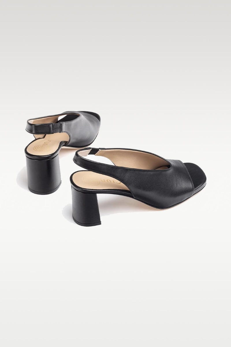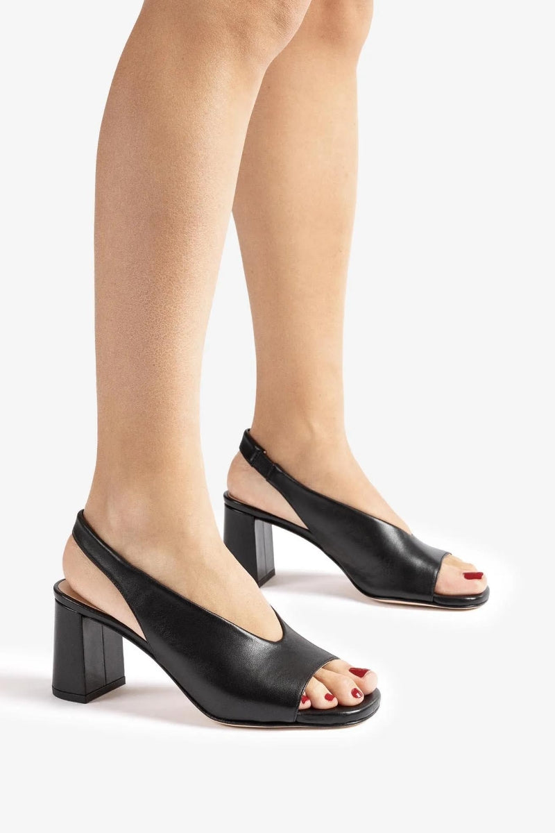 Mondy er en ny modell som vil bli sommerens store favoritt. Superkul modell i nydelig mykt sort skinn, åpen tå og slingback. 5 cm høy hel. Det er elastisk strikk i remmen bak som gjør at den sitter godt på foten og passer mange.