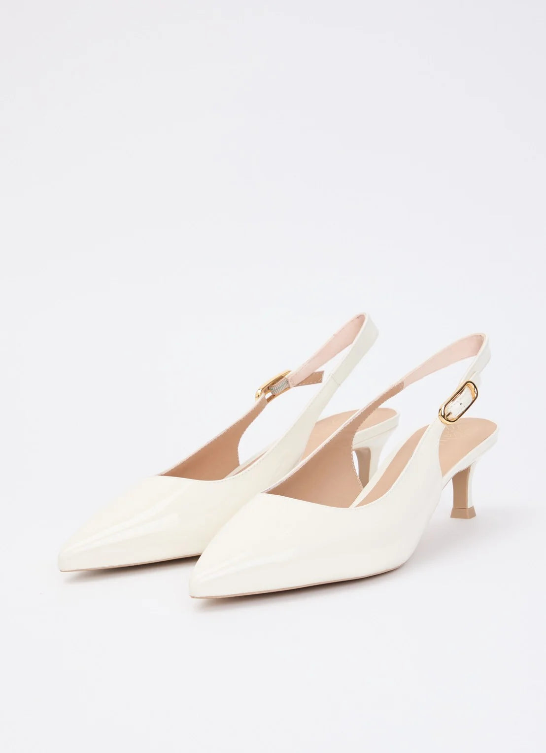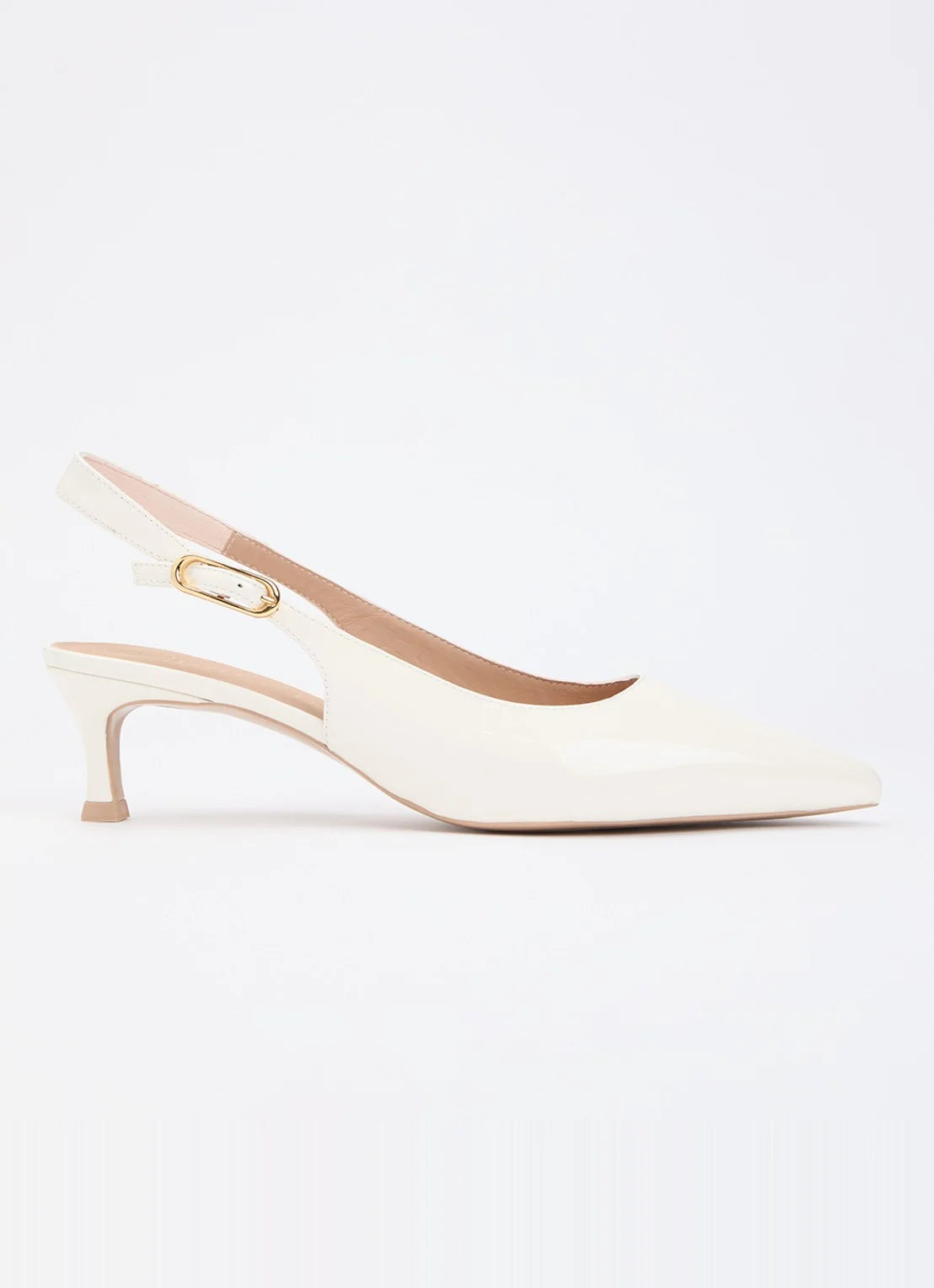 Spiss med slingback med regulerbar spenne, i myk beige skinnlakk. Ca 3 cm helhøyde.