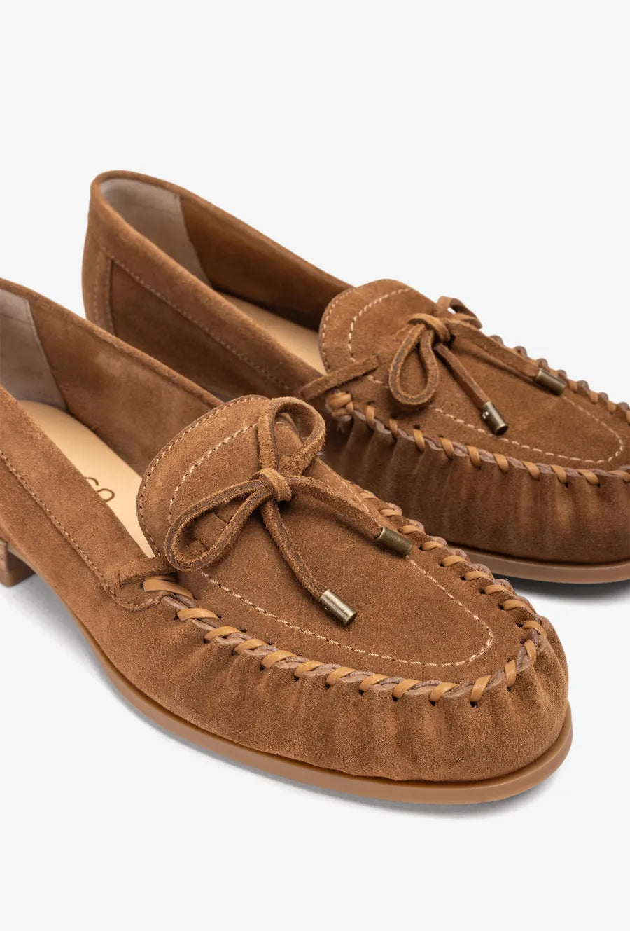 Loafer i semsket skinn med rund tå og matchende sløyfe. Lett, fleksibel og skli-sikker gummisåle. Liten hel.