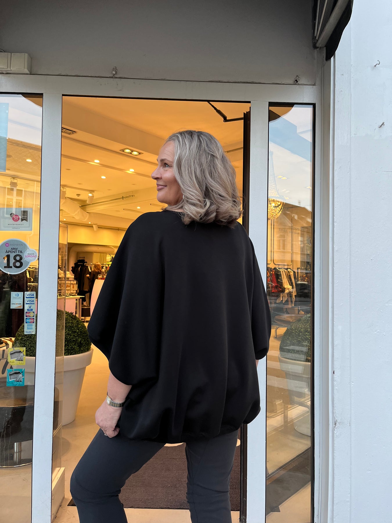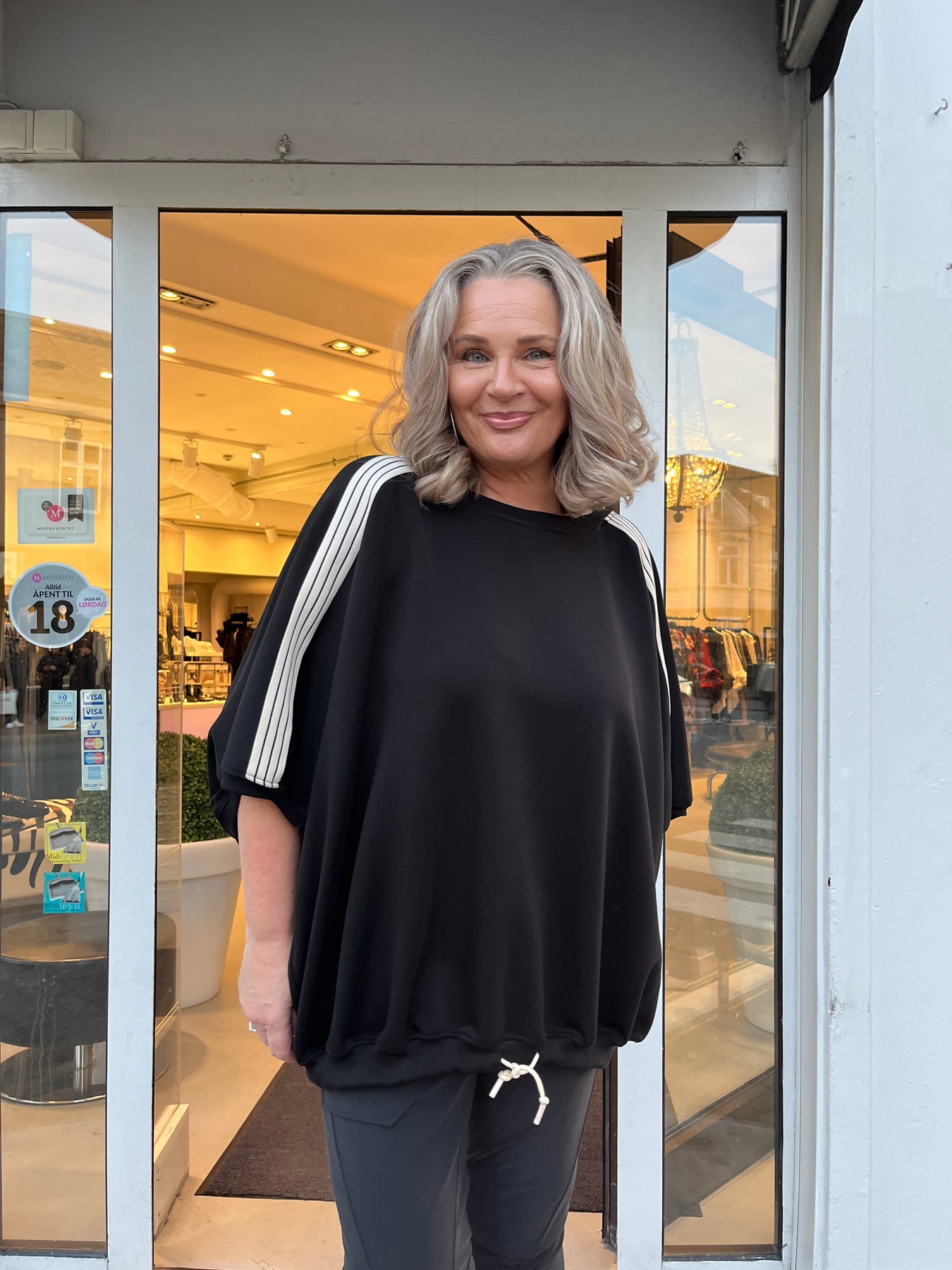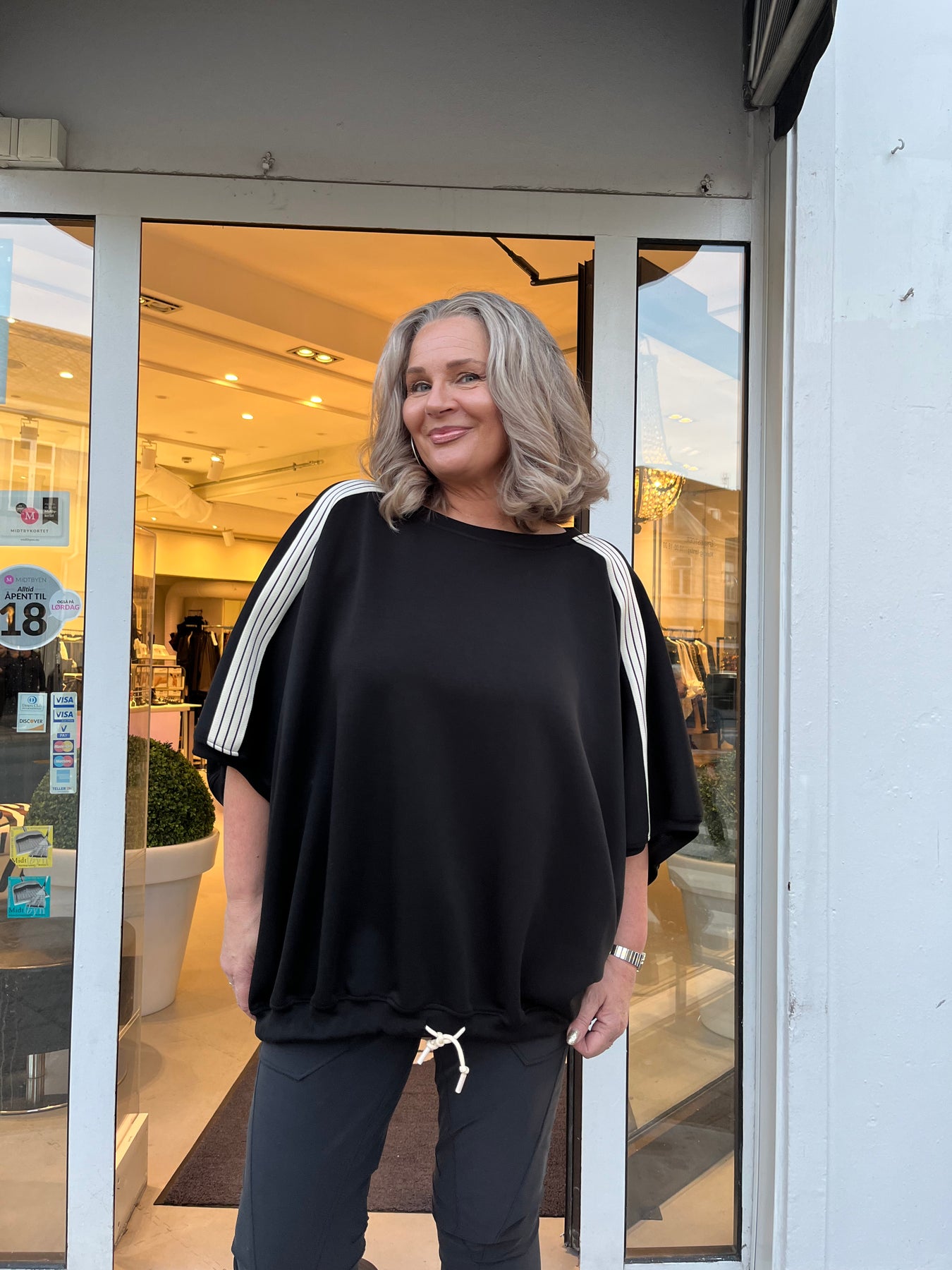 Sort, lett og supermyk sort topp med hvite striper i siden fra skulderen og ut på armene. Korte ermer, rund hals, hvit snøring nederst - en modell med god vidde og herlig passform.