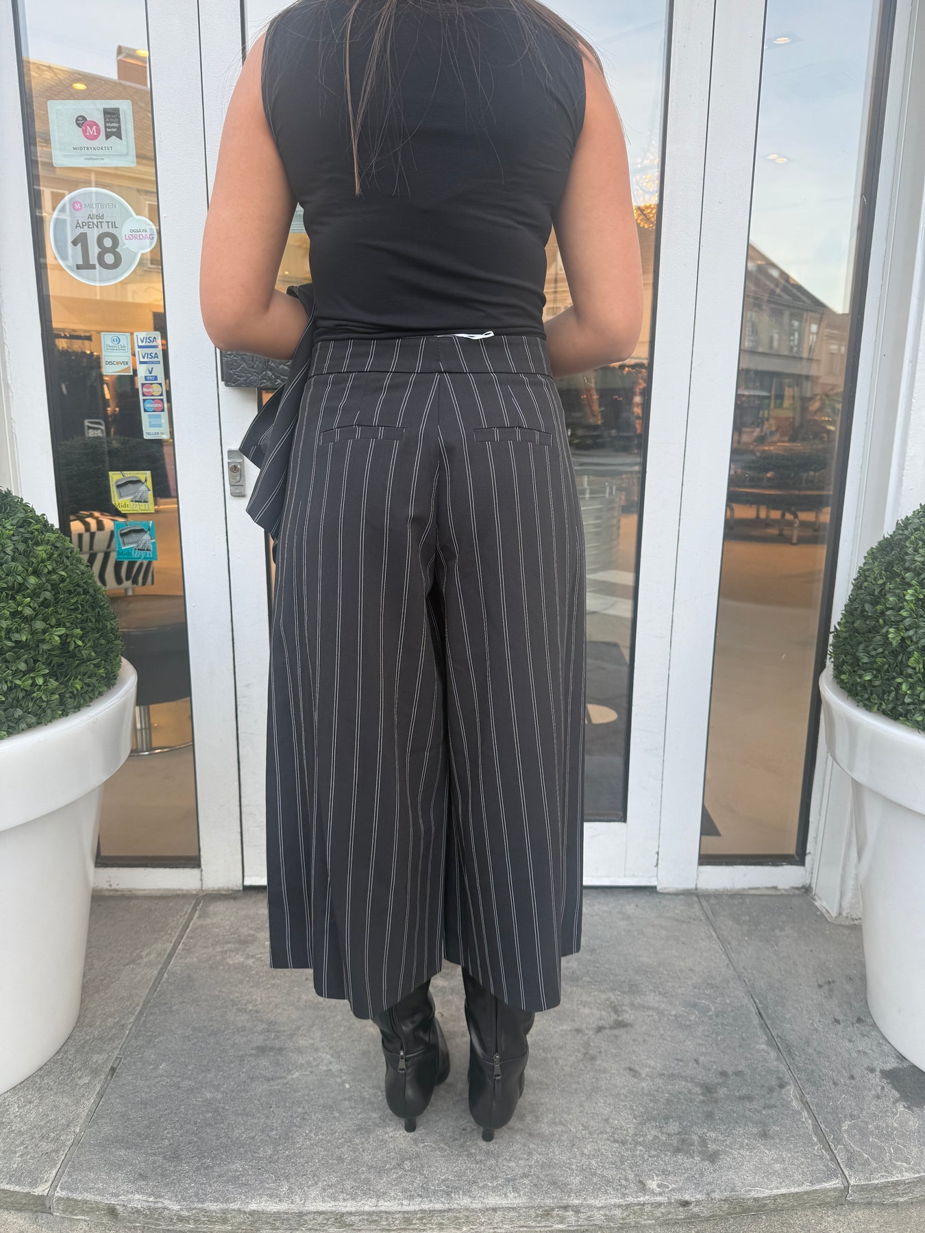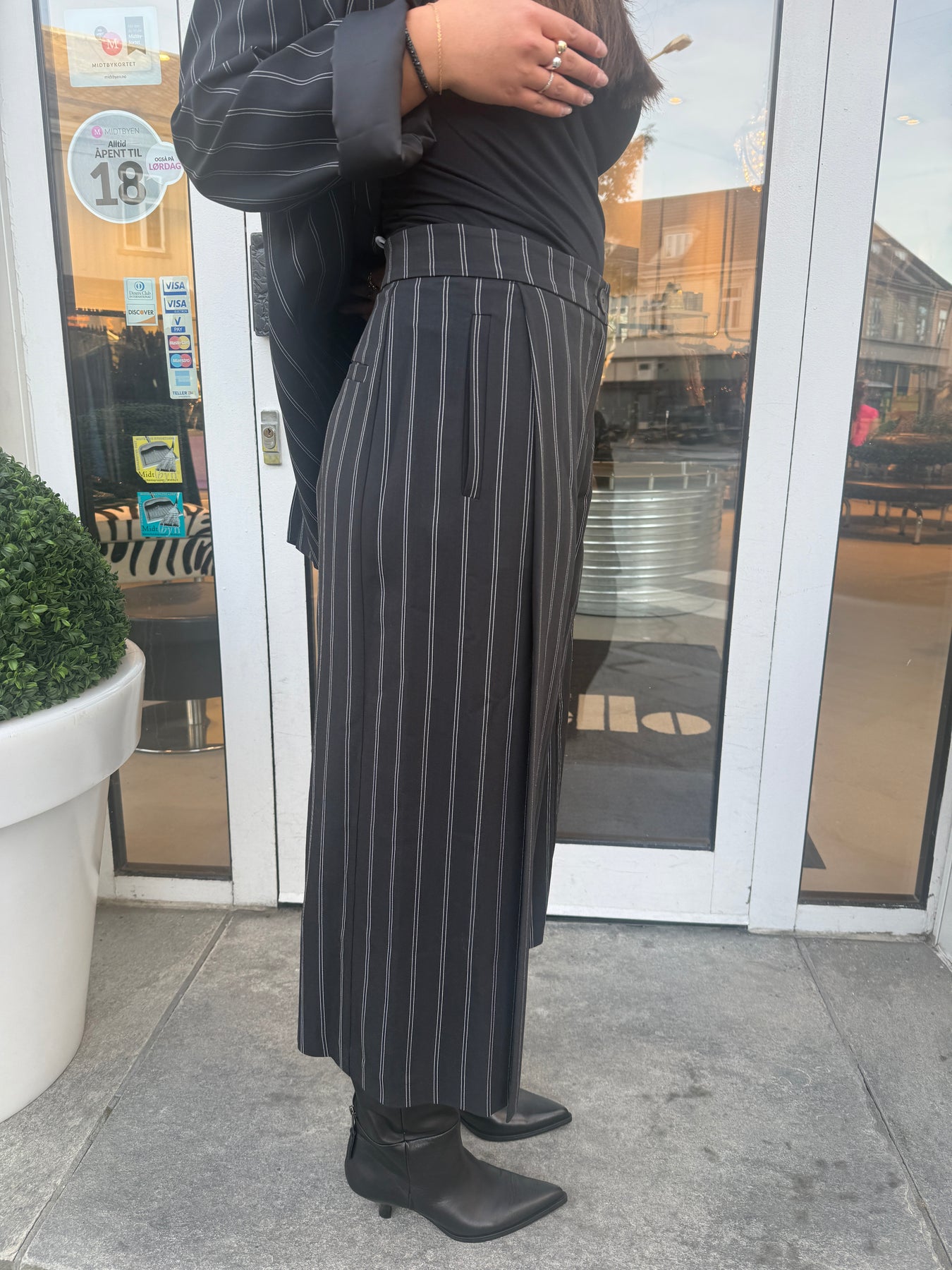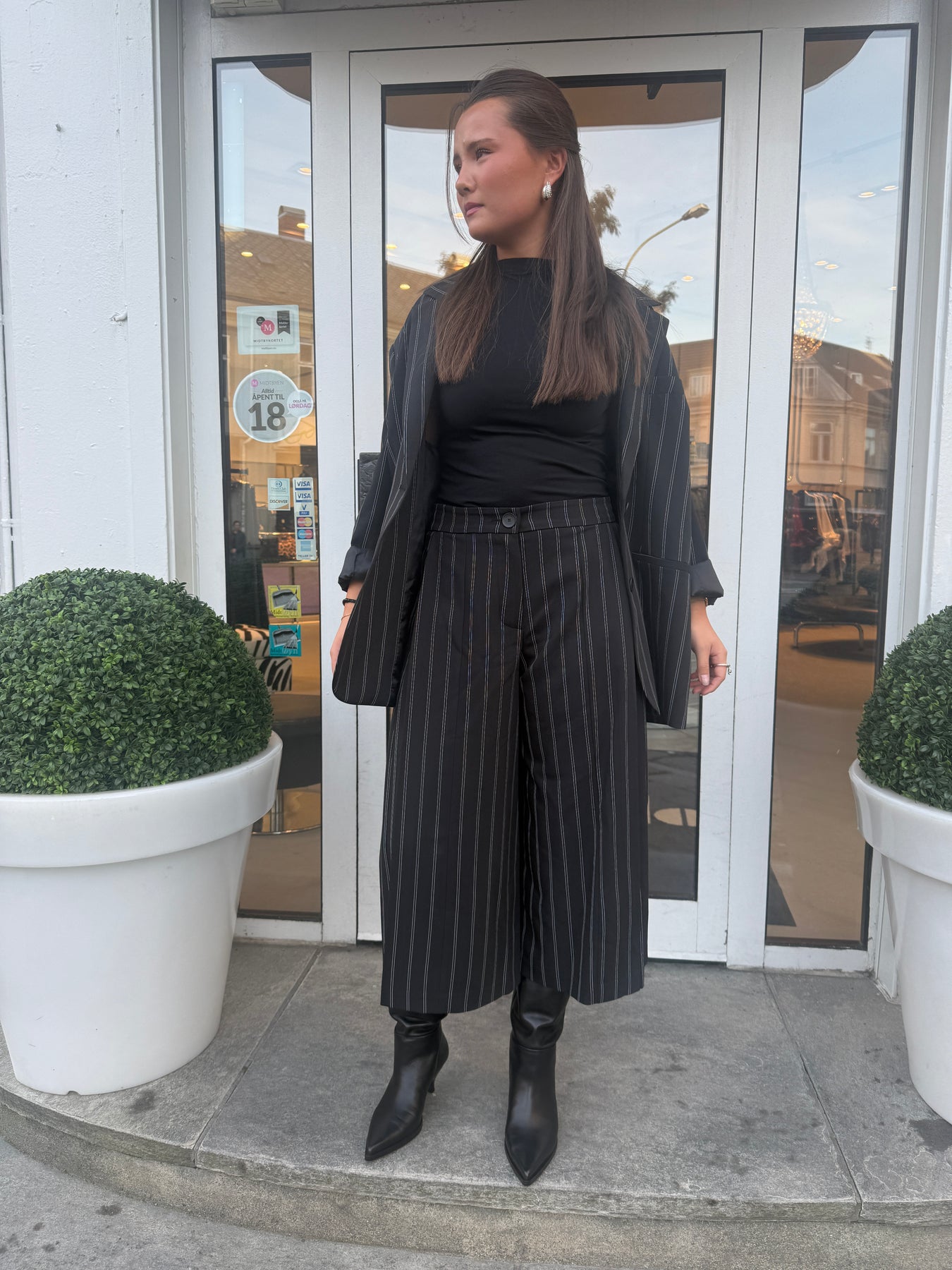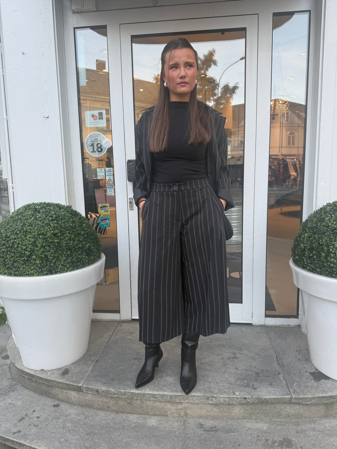 Ny råtøff cropped dressbukse i sort med hvite striper. Linning, knapp og glidelås foran - lommer i siden og enkelt legg foran.