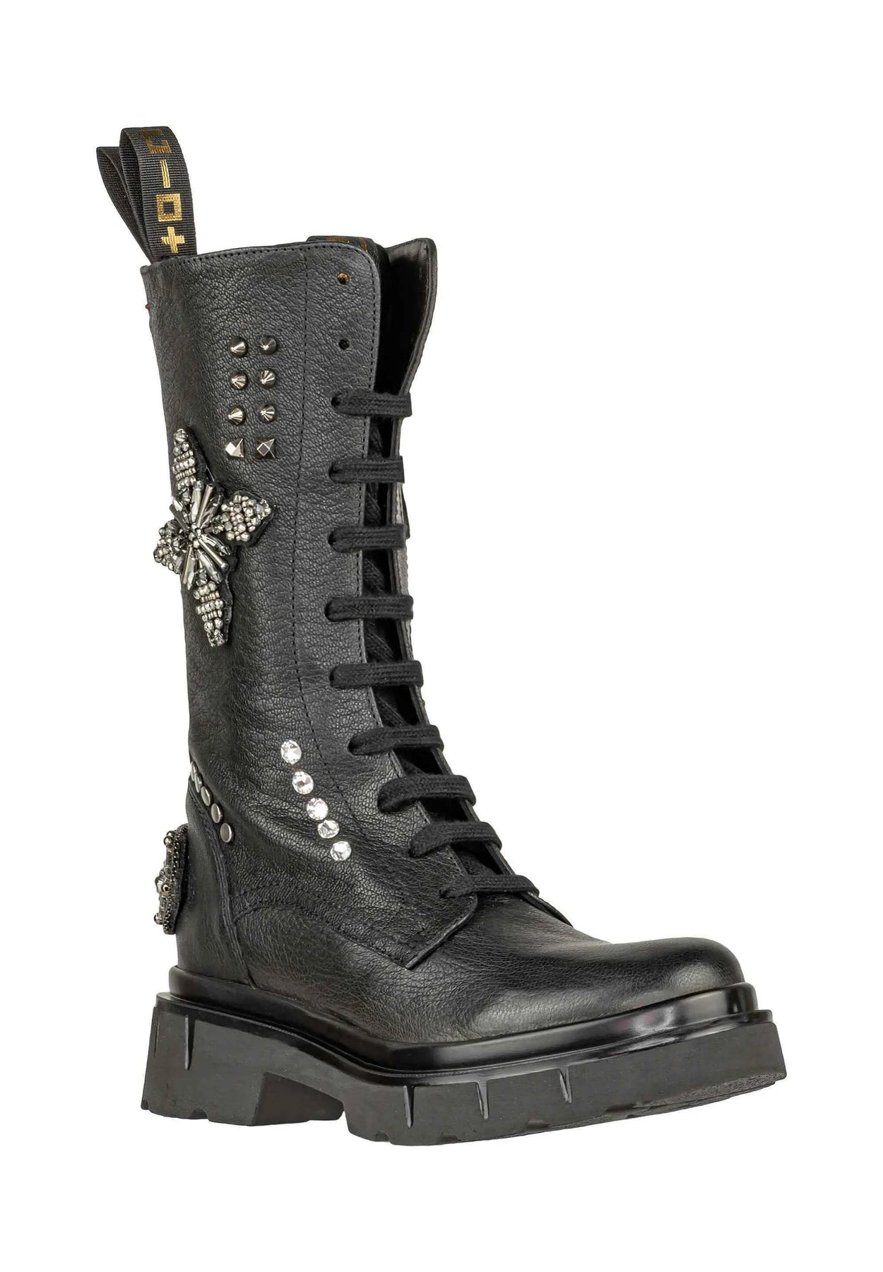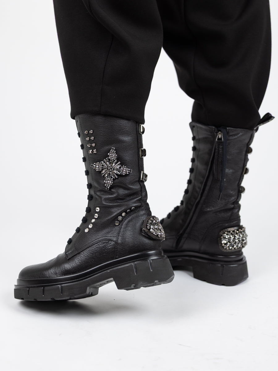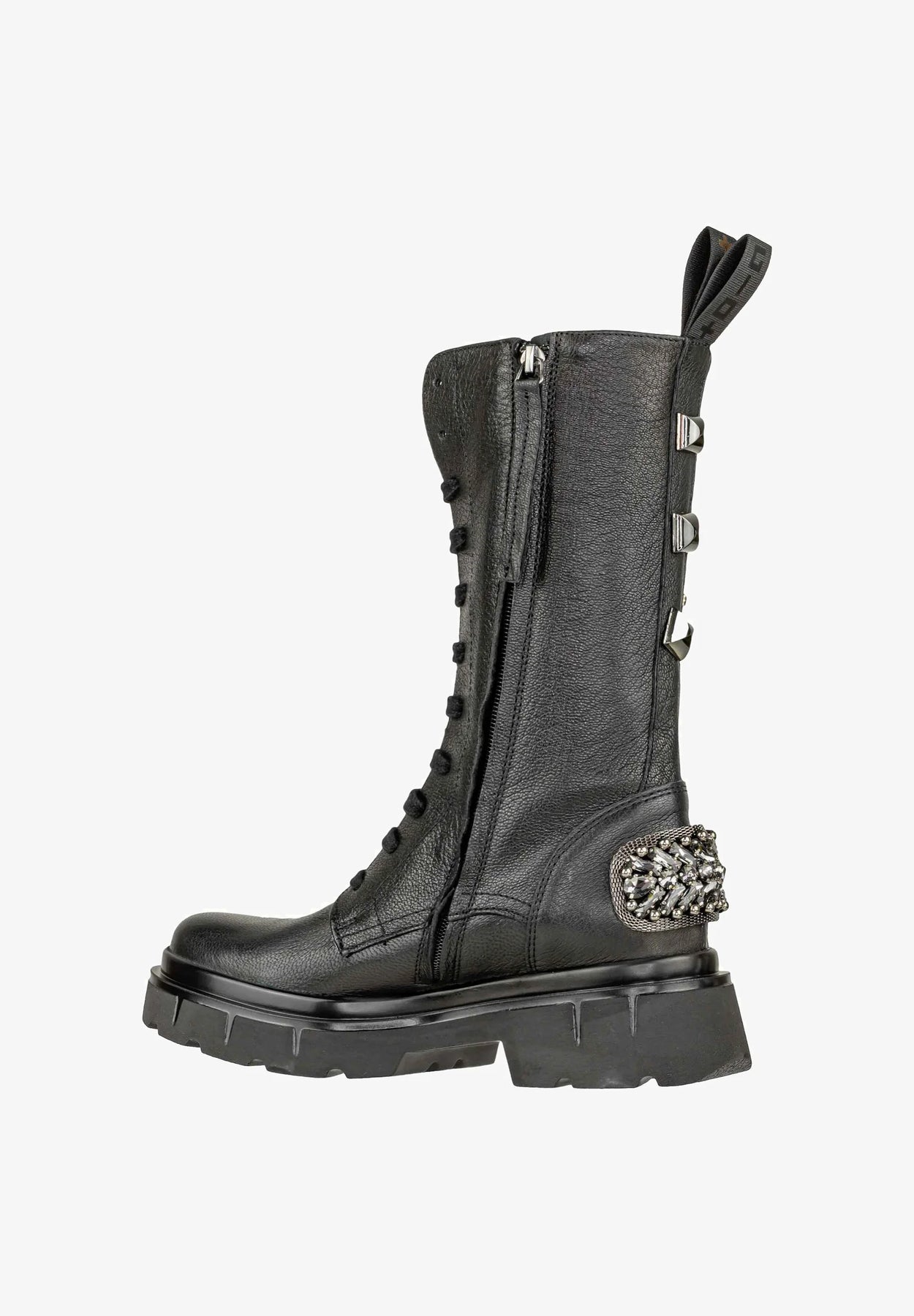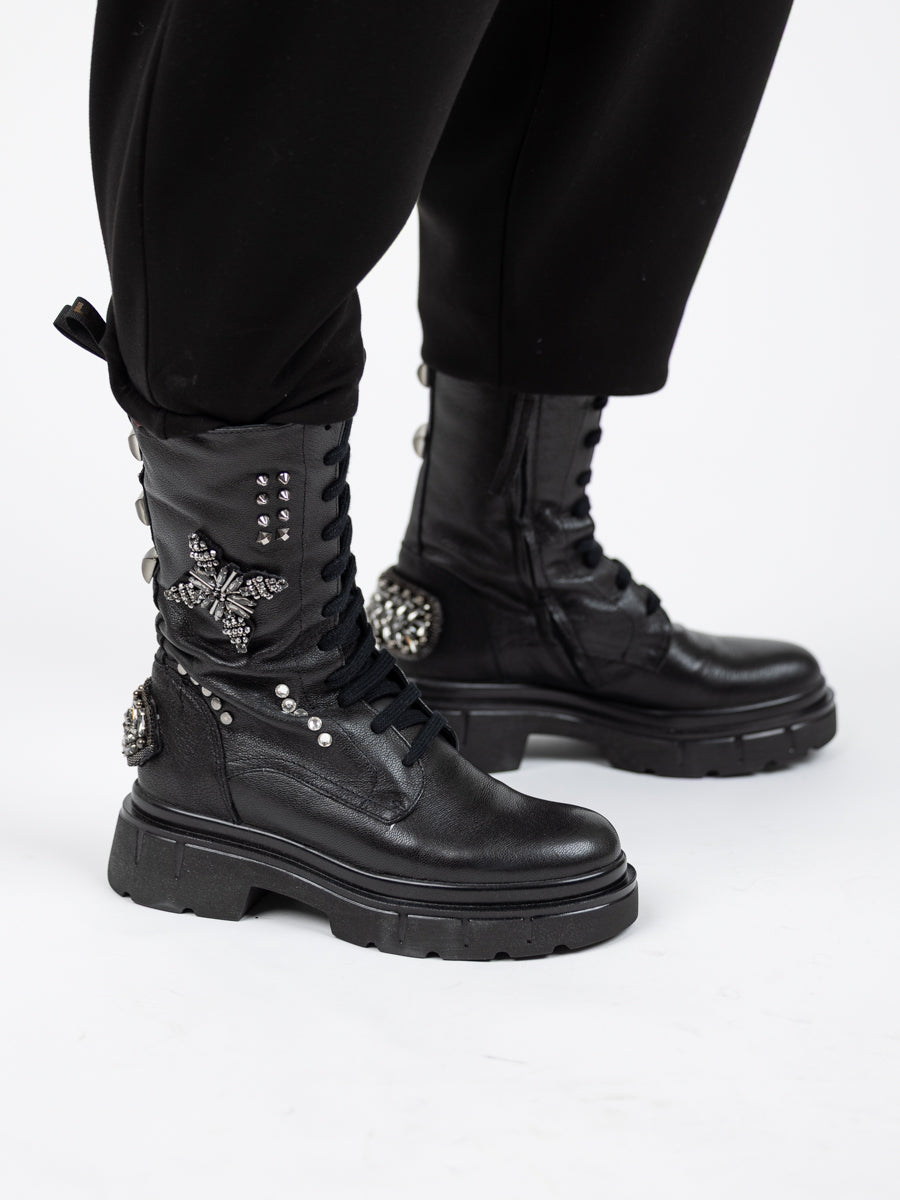 Lang skolett med snøring foran, rålekker strasspynt bak og på sidene - glidelås i innsiden slik at den er lett å få av og på.